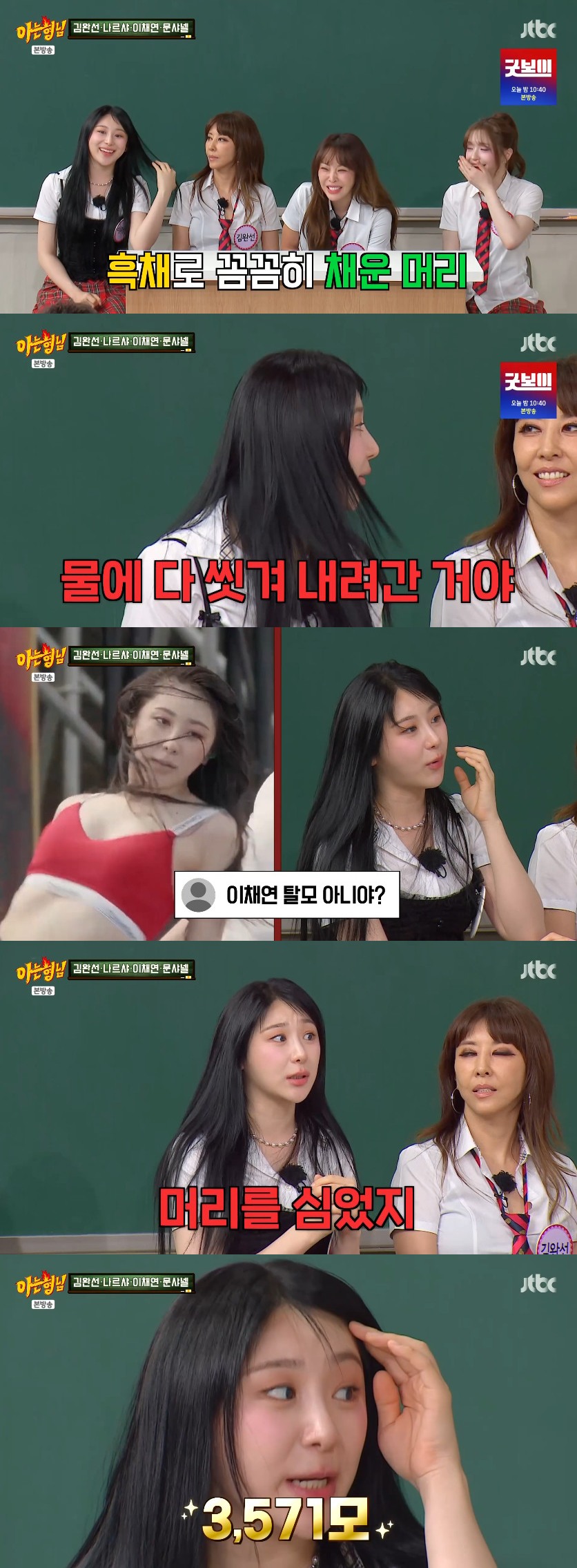 이채연은 총 3,571모를 심었다고. 나르샤는 "3,000모 넘어가면 많이 심은 거다"고 말했고, 서장훈은 2년 전 '아는 형님'에 출연했던 모발이식 전문가 한상보를 언급했다.