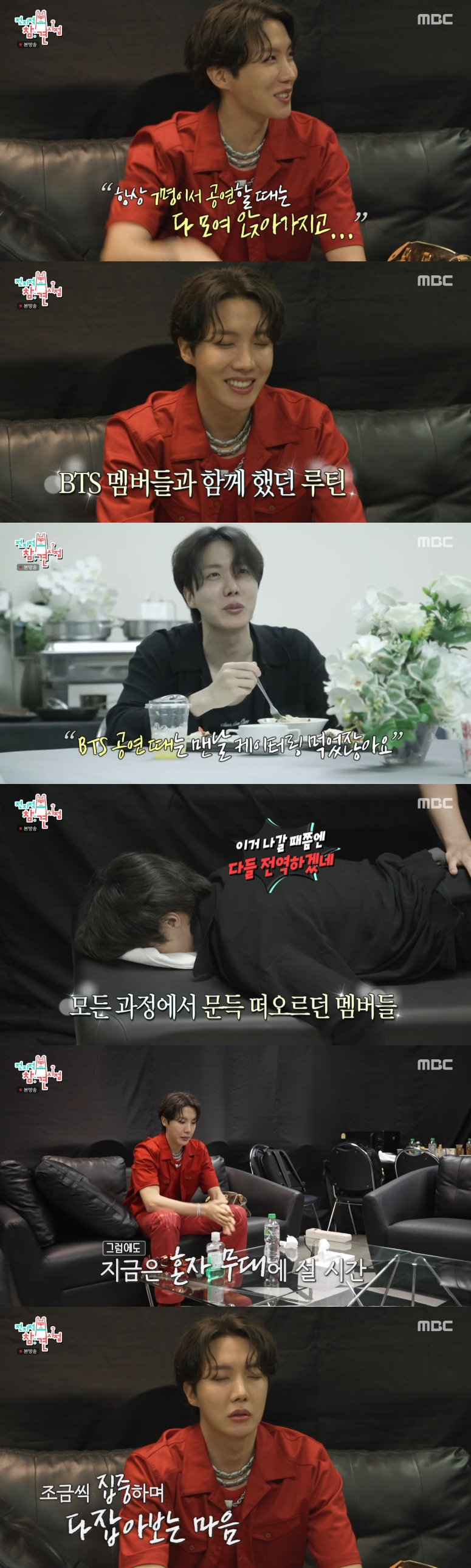 공연 전 밥을 먹던 제이홉은 "옛날에 BTS 때는 매일 케이터링 와서 먹었다"며 추억을 회상했고, 마사지를 받을 때도 "이거 나갈 때쯤엔 애들 다 전역해 있겠네"라며 멤버들을 떠올렸다.