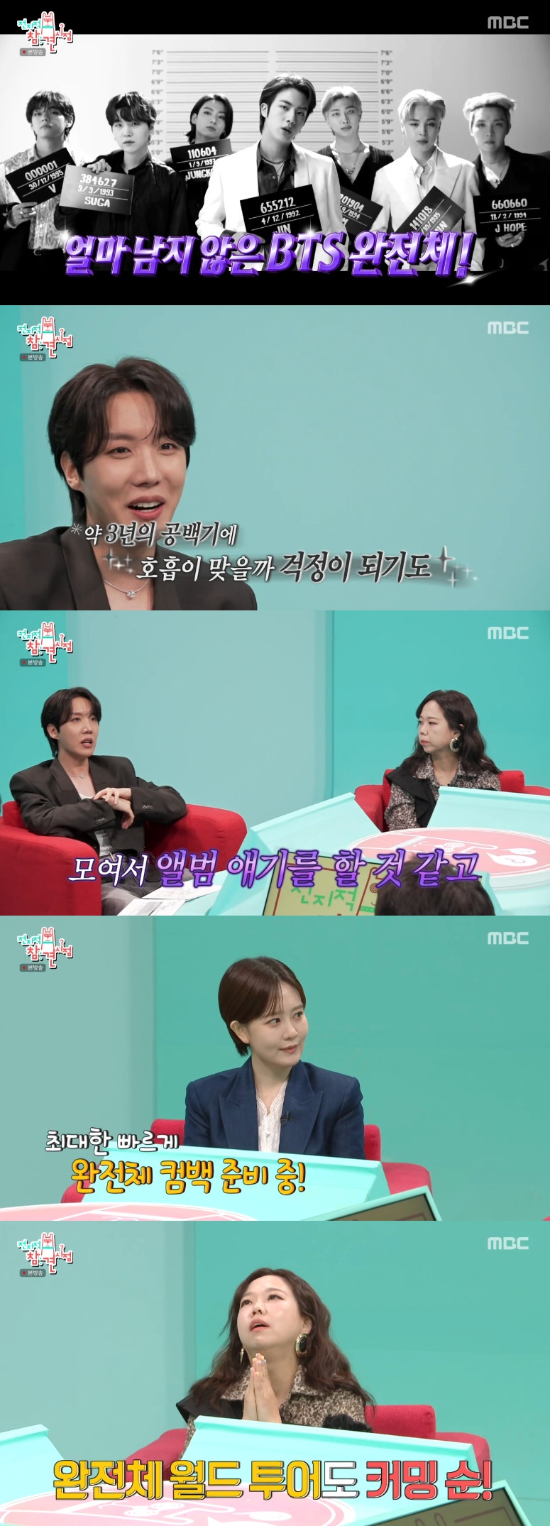 전현무가 "앞으로의 완전체로서의 계획은 아직 안 나온 거냐"고 묻자 제이홉은 "모여서 앨범에 관련된 이야기를 할 것 같다"면서 "최대한 빠른 시기로 준비를 하려고 노력하고 있다. BTS는 또 공연이다 보니까 월드 투어에 대한 준비도 들어갈 것 같다"라고 완전체 컴백과 앞으로의 활동을 예고해 눈길을 끌었다.