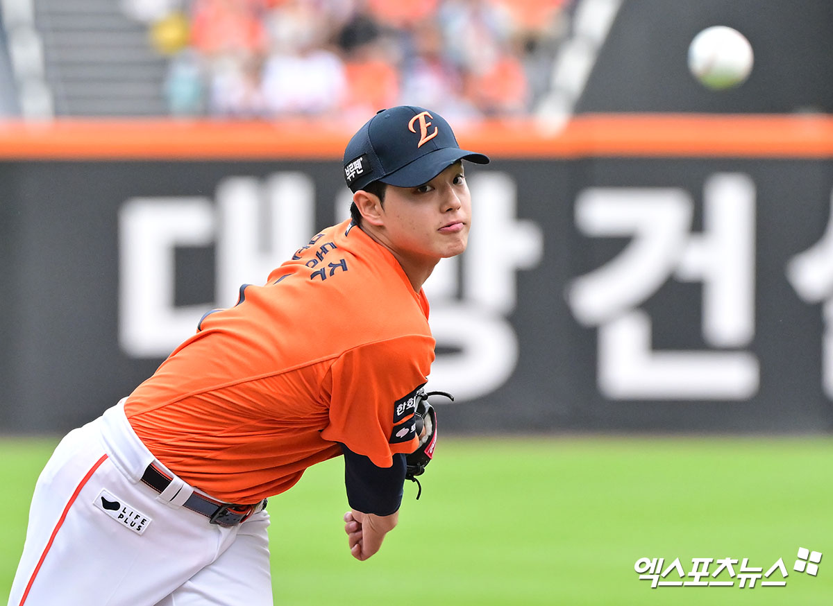 (엑스포츠뉴스 대전, 김한준 기자) 15일 오후 대전 한화생명 볼파크에서 열린 '2025 신한 SOL Bank KBO리그' LG 트윈스와 한화 이글스의 경기, 1회초 한화 선발투수 문동주가 공을 힘차게 던지고 있다.