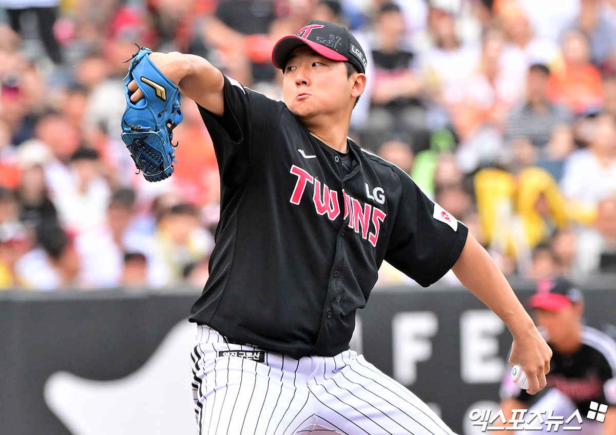 (엑스포츠뉴스 대전, 김한준 기자) 15일 오후 대전 한화생명 볼파크에서 열린 '2025 신한 SOL Bank KBO리그' LG 트윈스와 한화 이글스의 경기, 1회말 LG 선발투수 송승기가 공을 힘차게 던지고 있다.
