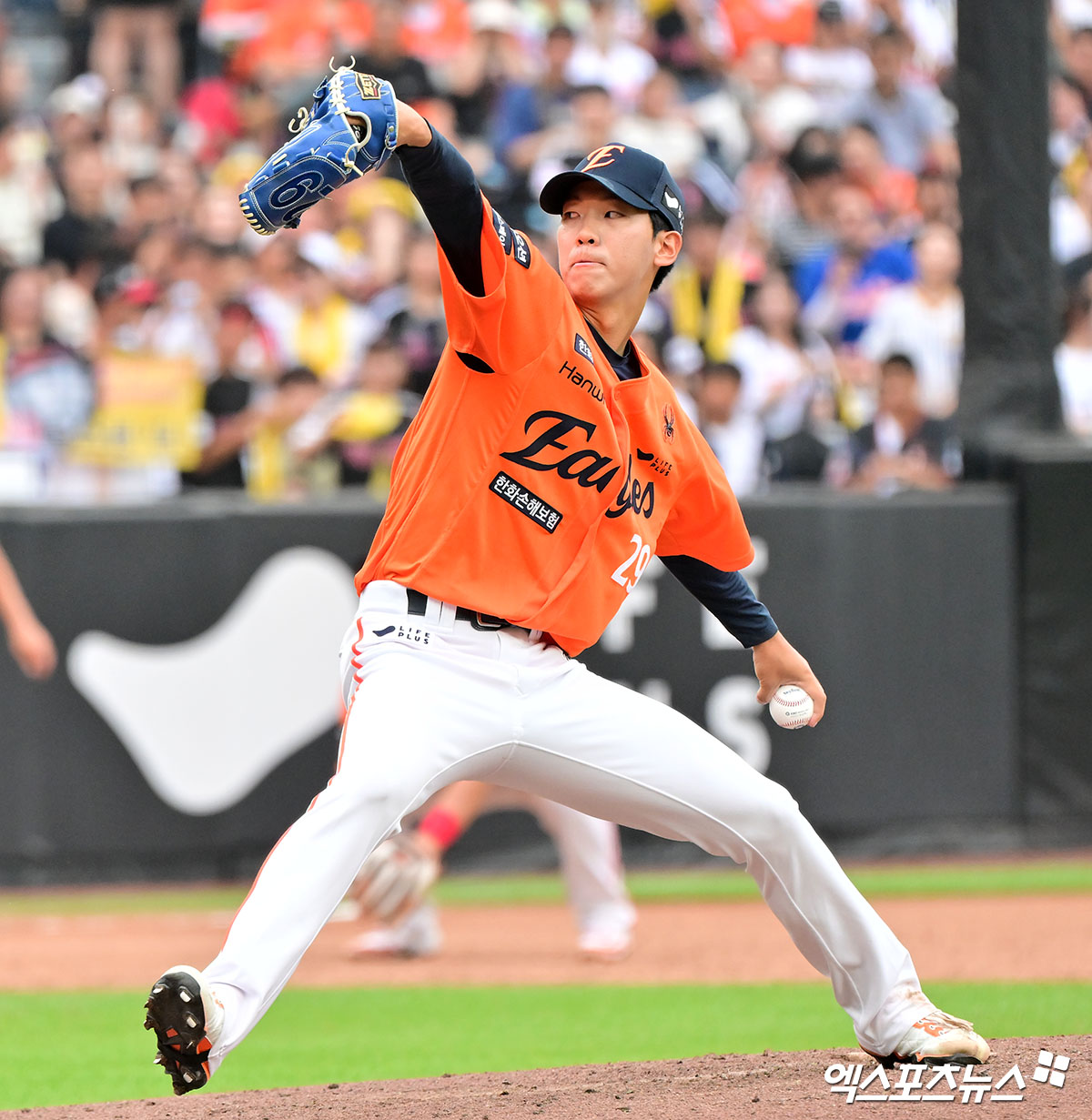 (엑스포츠뉴스 대전, 김한준 기자) 15일 오후 대전 한화생명 볼파크에서 열린 '2025 신한 SOL Bank KBO리그' LG 트윈스와 한화 이글스의 경기, 4회초 2사 1,3루 한화 황준서가 공을 힘차게 던지고 있다.