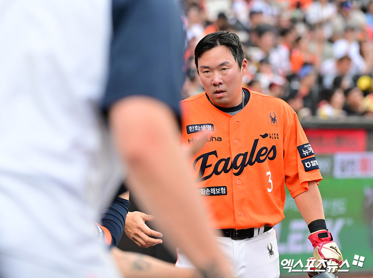(엑스포츠뉴스 대전, 김한준 기자) 15일 오후 대전 한화생명 볼파크에서 열린 '2025 신한 SOL Bank KBO리그' LG 트윈스와 한화 이글스의 경기, 4회말 1사 만루 한화 안치홍이 이진영의 1타점 희생플라이때 득점에 성공하고 있다.