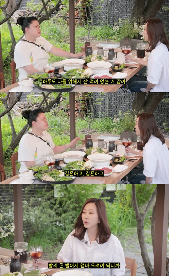 매실주를 마시면서 김남주는 "20년 만에 눈물 날 만큼 감동스럽다"고 말했다. 그는 "안 믿으실 수 있지만 제가 하루도 나를 위해 산 적이 없는 것 같다. 결혼 하고"라고 이야기했다.