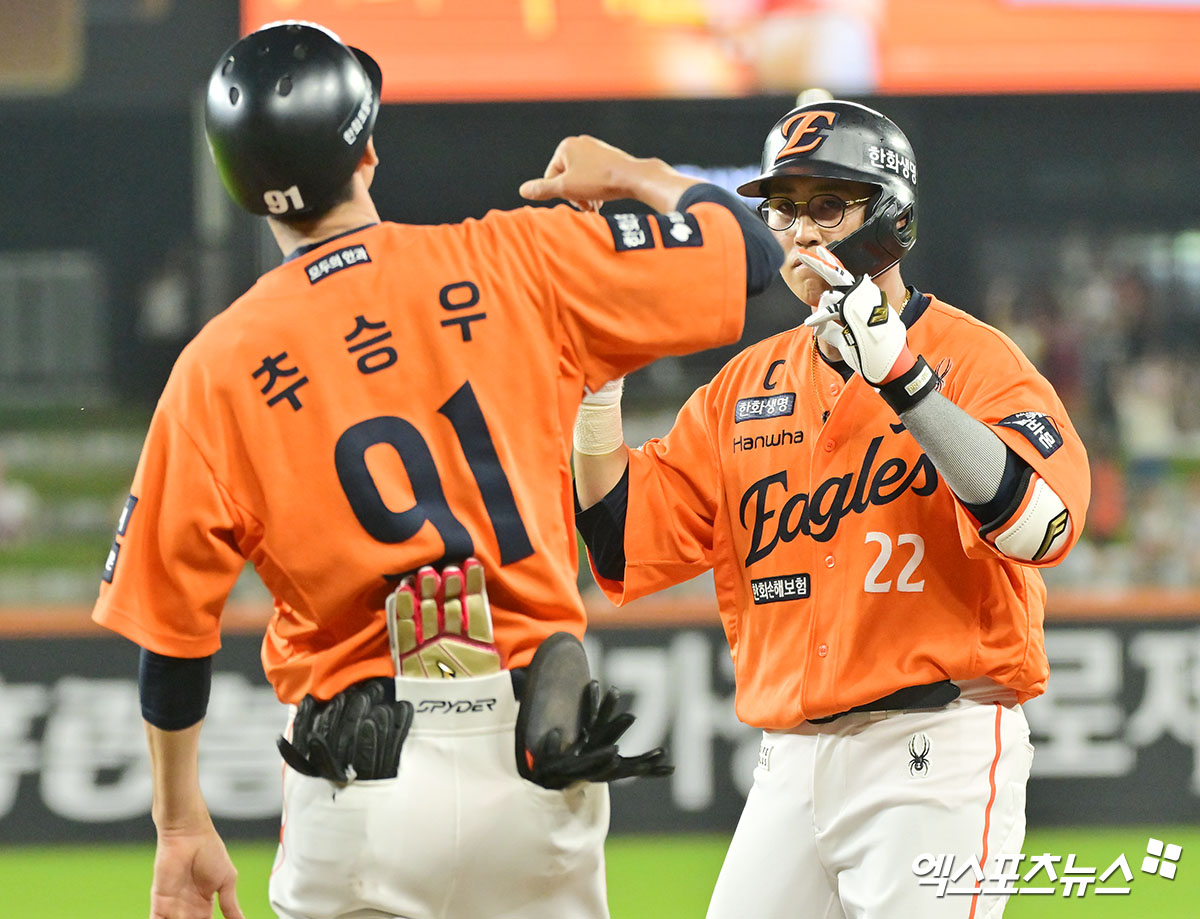 (엑스포츠뉴스 대전, 김한준 기자) 15일 오후 대전 한화생명 볼파크에서 열린 '2025 신한 SOL Bank KBO리그' LG 트윈스와 한화 이글스의 경기, 5회말 1사 2루 한화 채은성이 1타점 적시타를 날리고 있다.