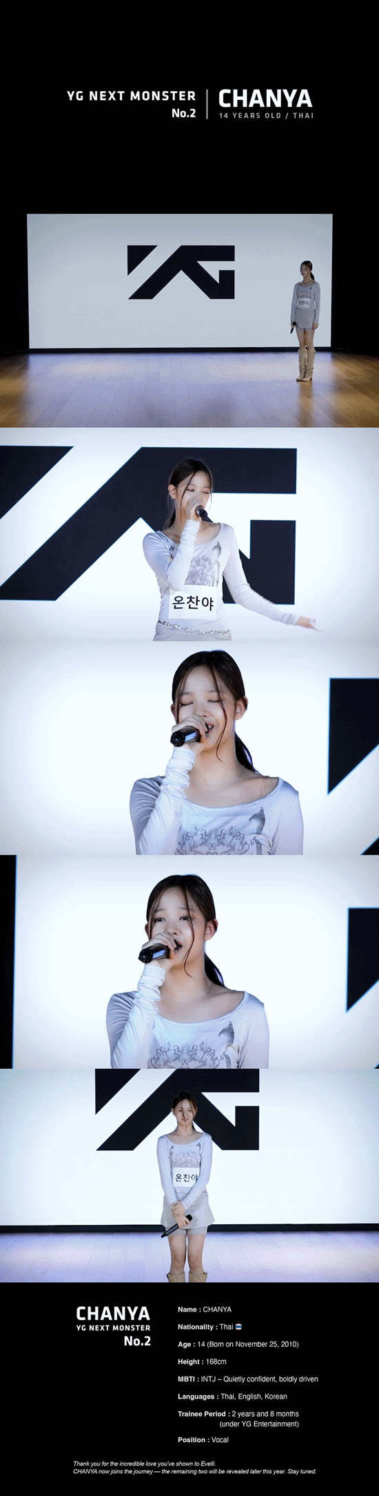 (엑스포츠뉴스 명희숙 기자) YG의 4인조 새 걸그룹 프로젝트 'YG NEXT MONSTER'가 글로벌 음악팬들의 뜨거운 호응을 얻고 있는 가운데, 태국 출신의 두 번째 연습생 '찬야 (CHANYA)'가 베일을 벗었다.