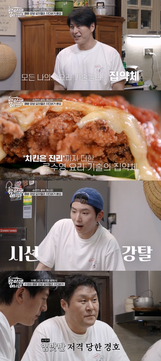 류수영은 “닭갈비와 양념치킨 그 중간 어딘가에 있다”고 자신의 메뉴를 설명했고, 촬영 중이던 제작진은 “5만5천원짜리 햄버거 같다”고 평해 류수영의 함박웃음을 이끌어냈다.