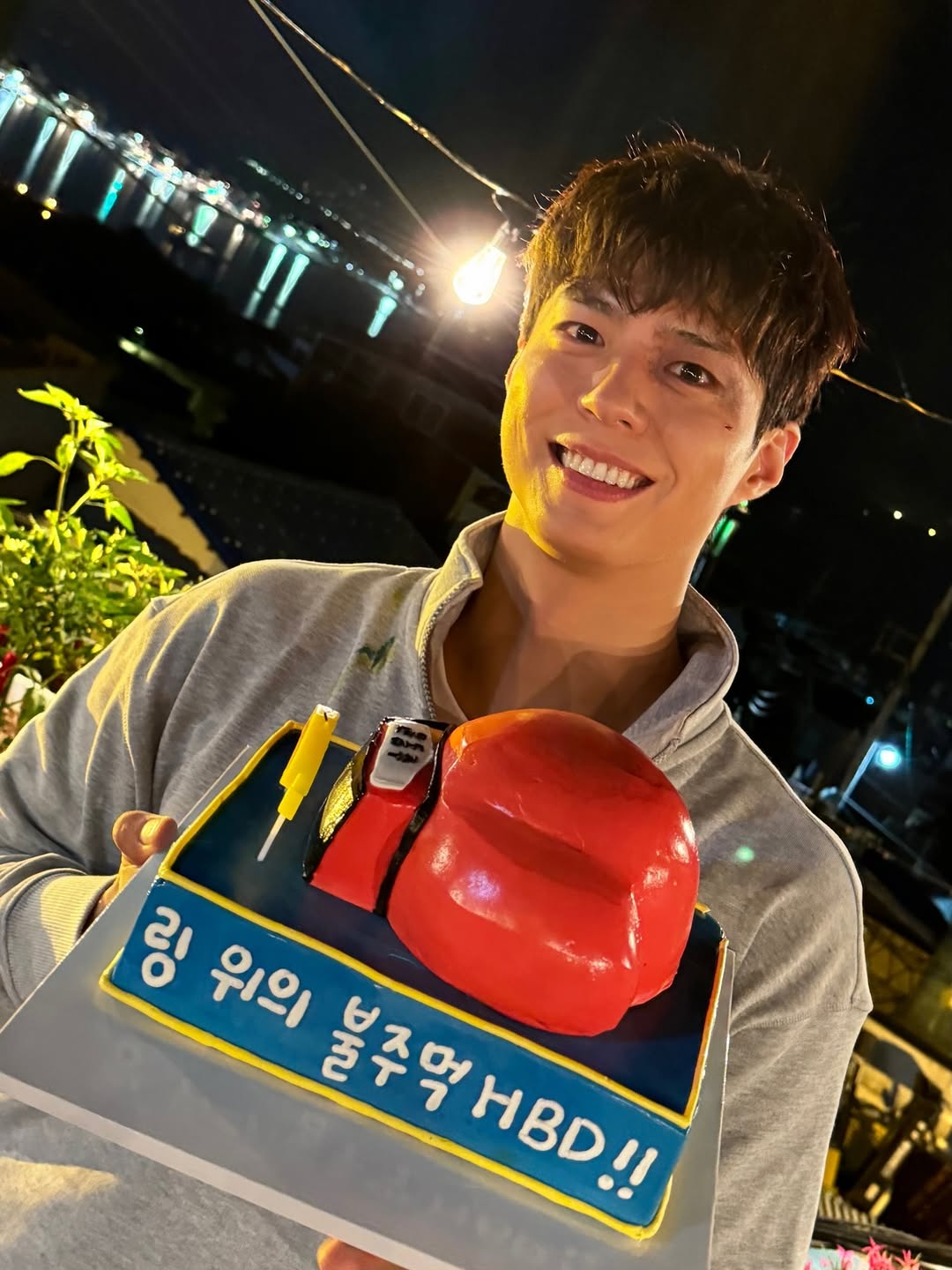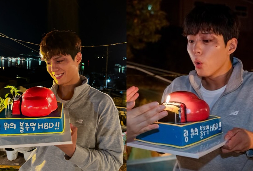공개된 사진 속 박보검은 '굿보이' 촬영장에서 생일을 맞아 맞춤 제작 케이크를 들고 있는 모습이다. 케이크에는 캐릭터에 맞게 '링 위의 불주먹 HBD!!'이라는 문구가 적혀 있어 눈길을 끈다.