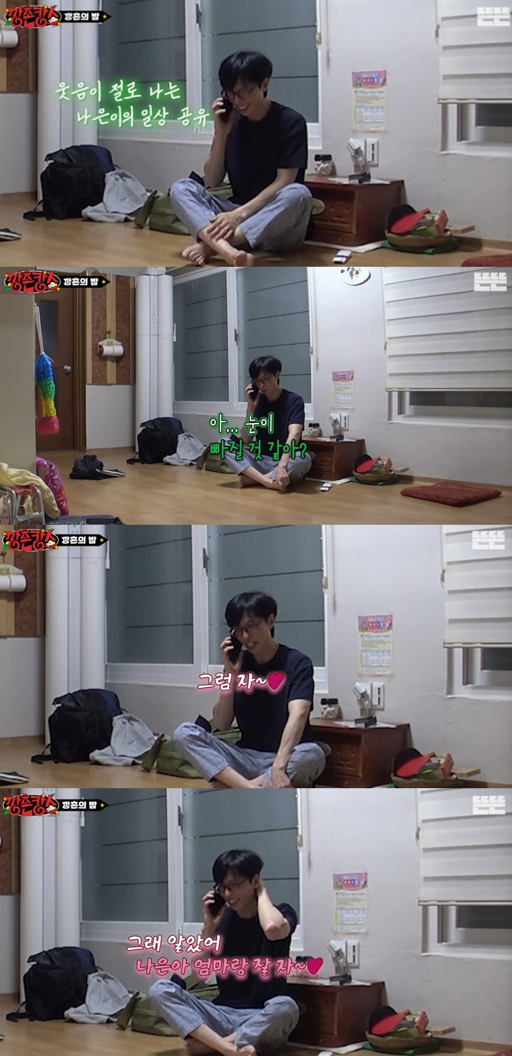 미소가 만개한 유재석은 딸의 어리광에 "눈이 빠질 것 같아? 그럼 자. 최선을 다했으면 됐어"라며 "알았어 나은아. 엄마랑 잘 자. 아빠는 내일 모레간다"고 애정을 내비쳤다.