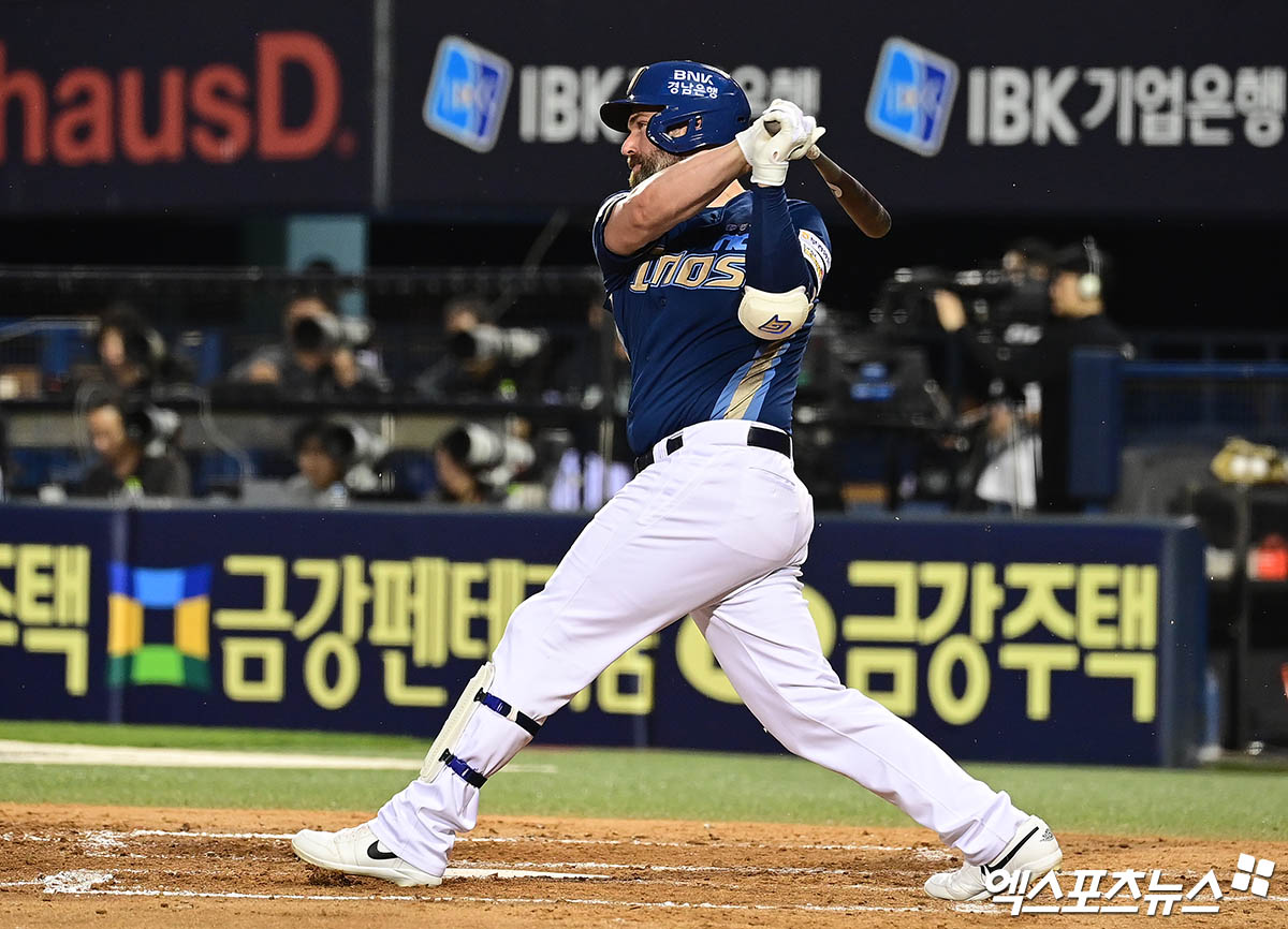 (엑스포츠뉴스 잠실, 박지영 기자) 18일 오후 서울 송파구 잠실야구장에서 열린 '신한 SOL Bank KBO리그' NC 다이노스와 LG 트윈스의 경기, 4회초 2사 1루 NC 데이비슨이 안타를 때려내고 있다.