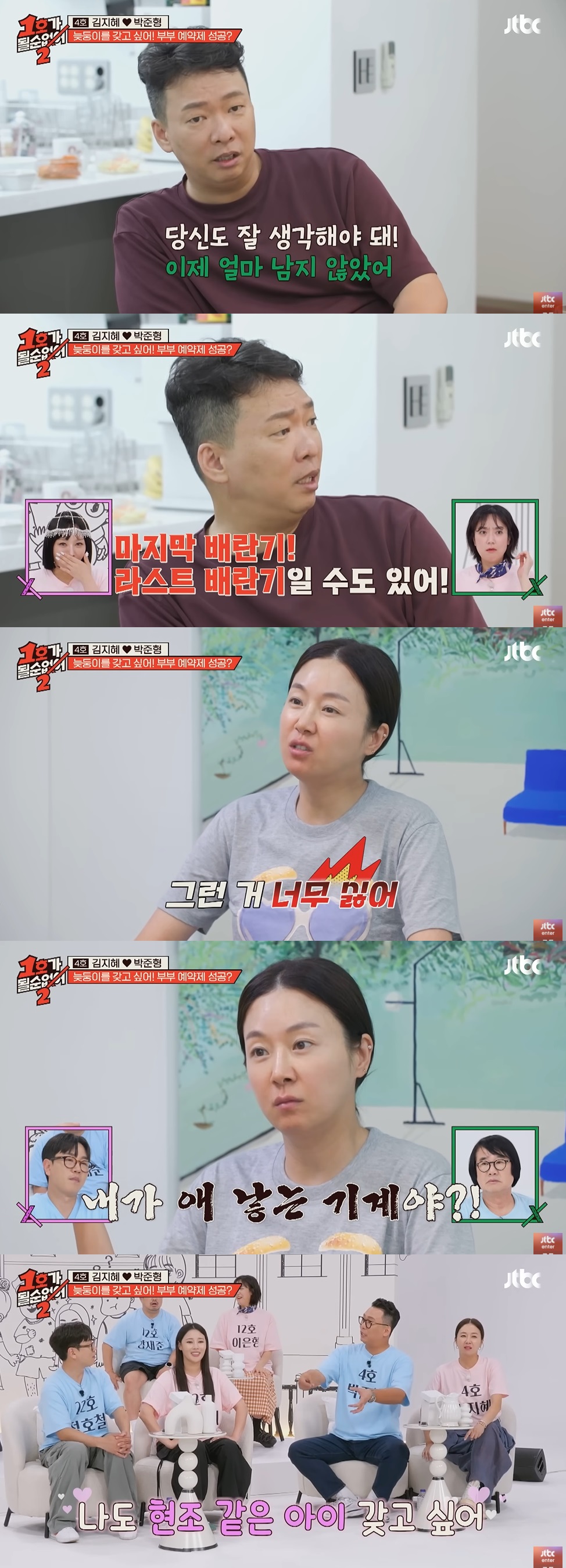 김지혜는 박준형의 말에 "내 건강과 그런 상황은 생각하지 않고 뜬금없이 셋째를 얘기하냐"라고 말하자, 박준형은 "당신도 생각해야 해. 이제 얼마 남지 않았어. 당신도 언제까지 젊을 것 같아. 이제 마지막 배란기. 라스트 배란기일 수도 있어"라고 덧붙였다.