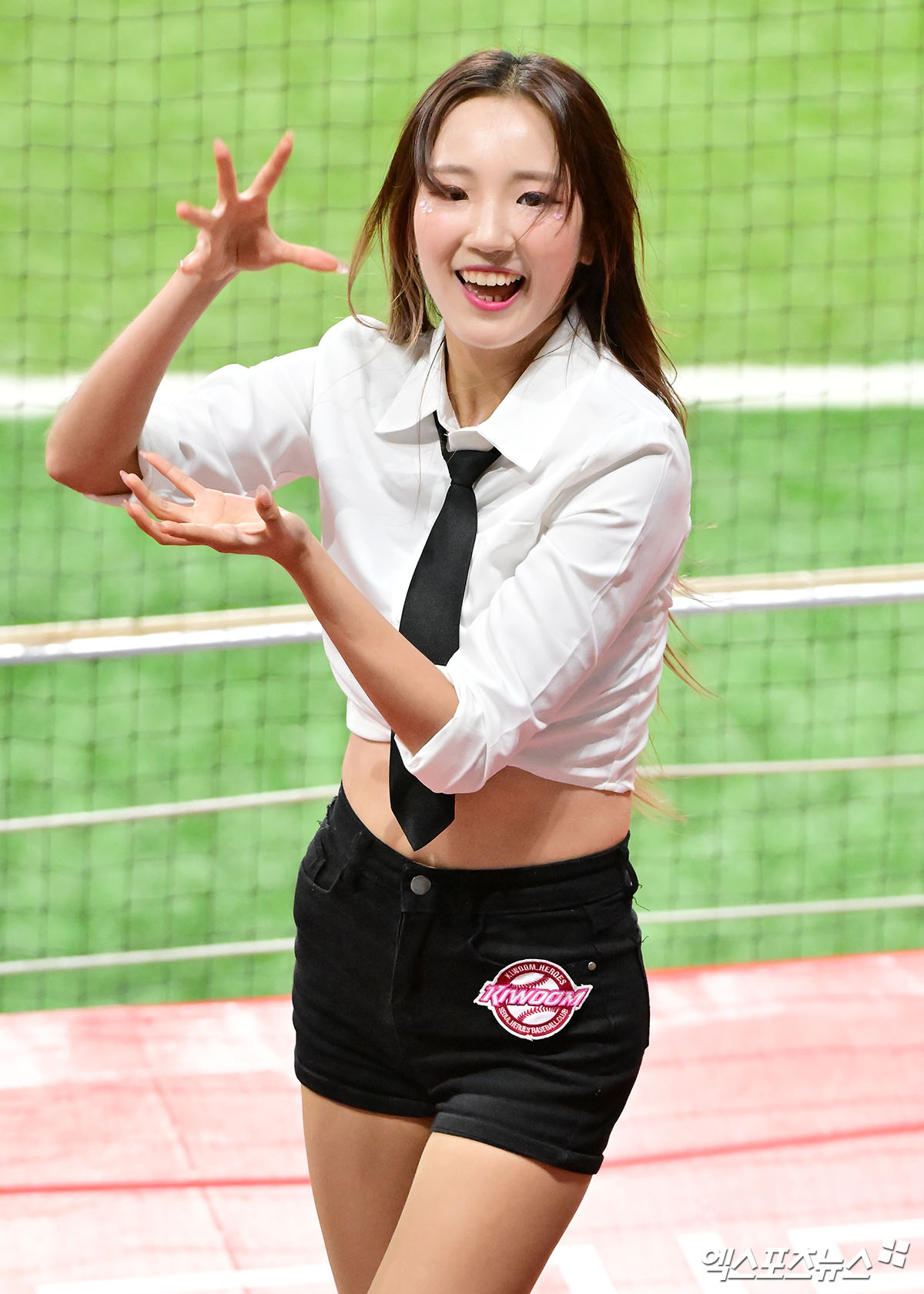 (엑스포츠뉴스 고척, 김한준 기자) 19일 오후 서울 구로구 고척스카이돔에서 열린 '2025 신한 SOL Bank KBO리그' SSG 랜더스와 키움 히어로즈의 경기, 차예나 치어리더가 멋진 공연을 선보이고 있다.
