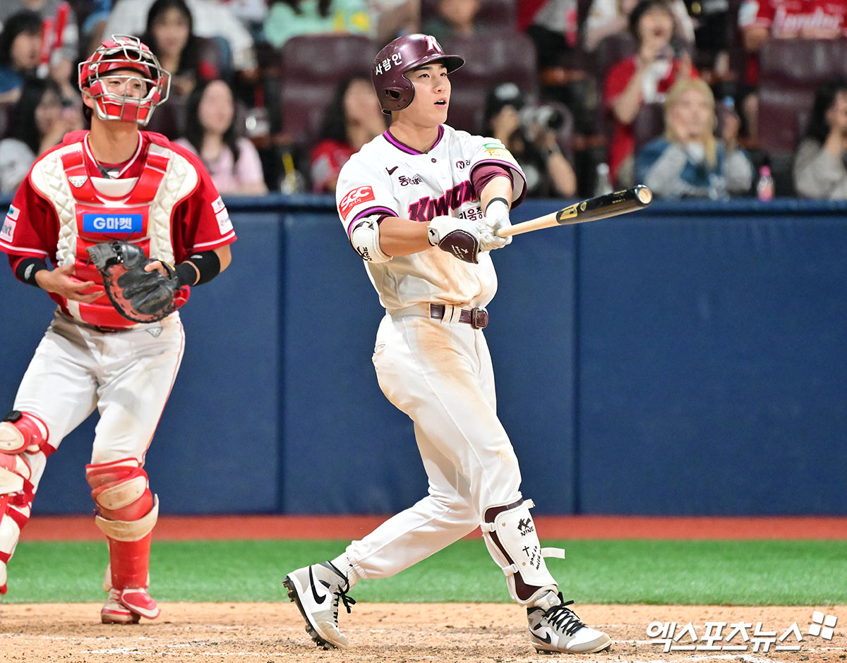 (엑스포츠뉴스 고척, 김한준 기자) 19일 오후 서울 구로구 고척스카이돔에서 열린 '2025 신한 SOL Bank KBO리그' SSG 랜더스와 키움 히어로즈의 경기, 9회말 2사 키움 이주형이 헛스윙 삼진을 당하고 있다.