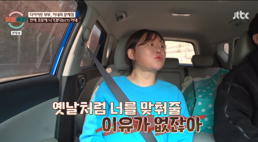 과거 지극정성으로 자신을 도왔던 아내를 언급한 남편. 이에 아내는 "살도 뺐는데 옛날처럼 해줄 이유가 없지 않냐"라고 말했다. 남편은 "'나 예뻐졌으니까 솔로 지옥 나갈 거다' '외국 나가면 헌팅이 잘 될 것이다' '헌팅을 나가면 침을 질질 흘릴 것이다'라고 하더라"라며 아내의 말을 전했다.