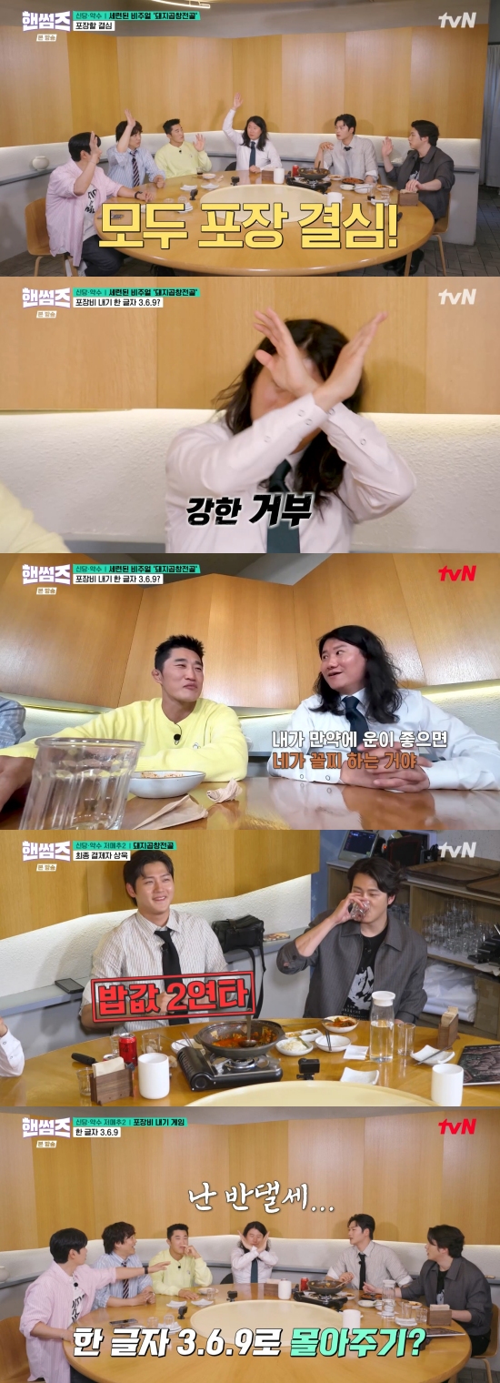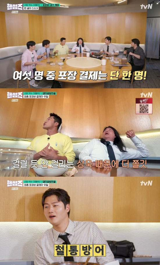 결국 오상욱이 밥값을 결제하게 됐고, 멤버들은 포장비 22만 원을 걸고 한글자 삼육구 게임을 하기로 했다. 임우일은 "대신 여기는 게임을 많이 해보지 않았냐"라며 걱정했고, 김동현은 "우리는 몇 번 해보지 않았냐 상욱이 한 번도 안 해봤다"라며 다독였다.