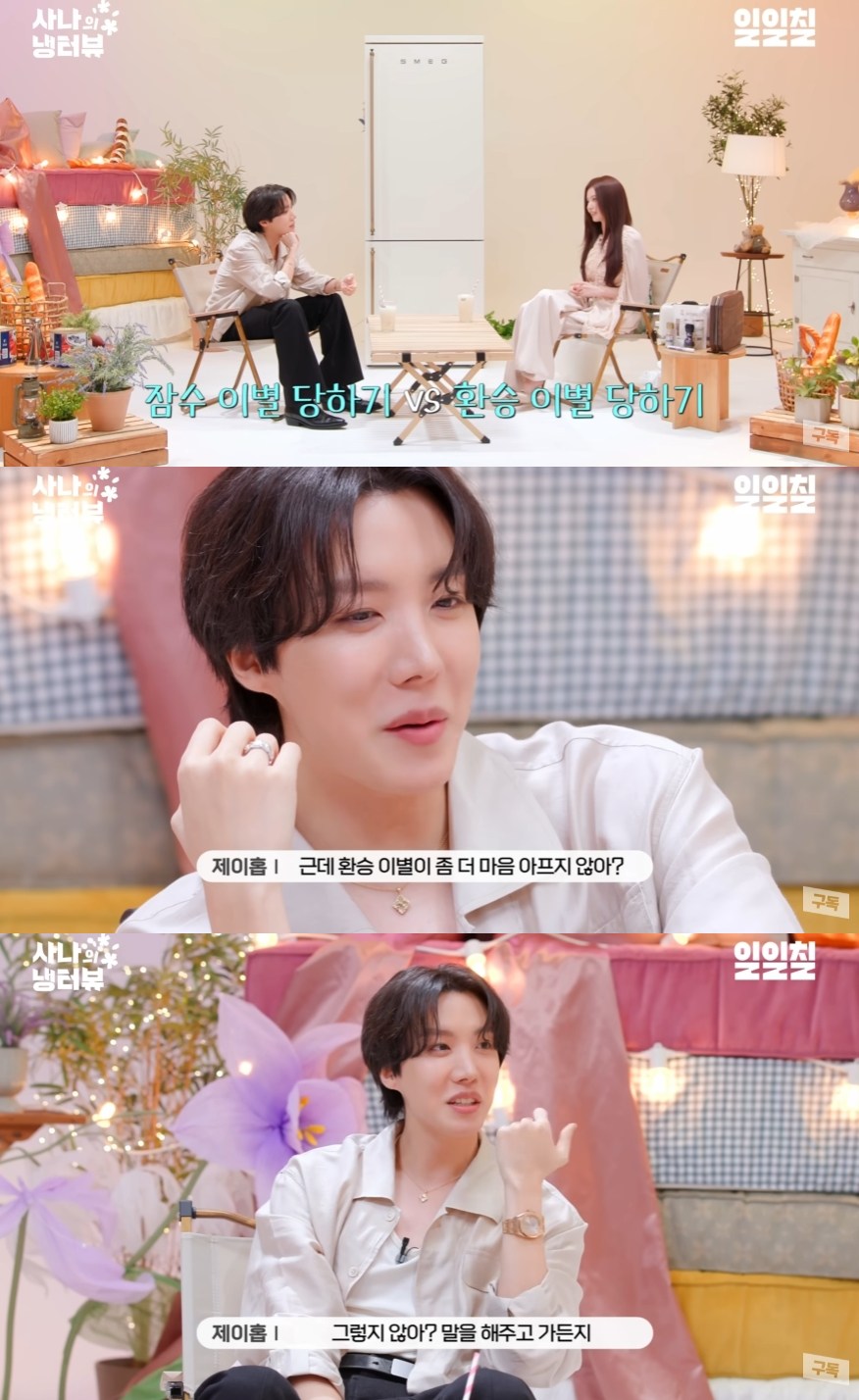 "잠수이별 당하는 것과 환승 이별 당하는 것 중에 택한다면"이라는 사나의 질문에 제이홉은 "둘 다 끔찍하긴 한데, 환승이별이 좀 더 마음 아프지 않냐"고 입을 열었다.
