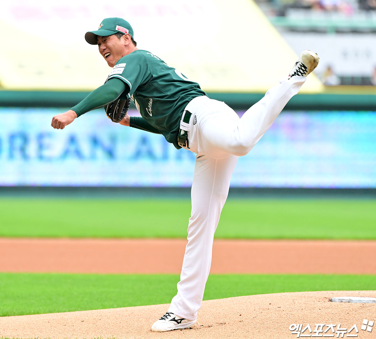 (엑스포츠뉴스 인천, 김한준 기자) 21일 오후 인천SSG랜더스필드에서 열린 '2025 신한 SOL Bank KBO리그' KIA 타이거즈와 SSG 랜더스의 경기, 1회초 SSG 선발투수 김광현이 공을 힘차게 던지고 있다.