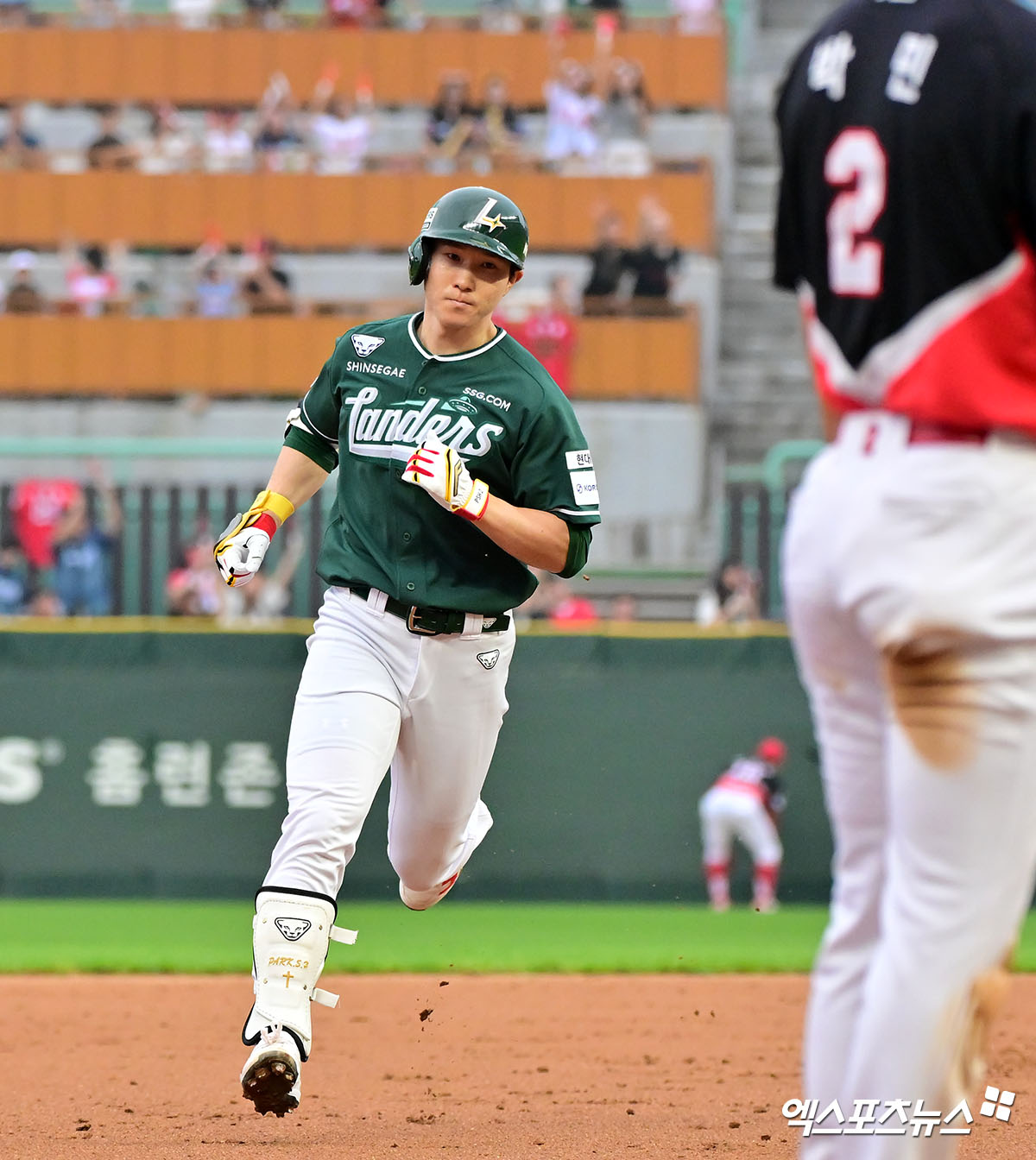 (엑스포츠뉴스 인천, 김한준 기자) 21일 오후 인천SSG랜더스필드에서 열린 '2025 신한 SOL Bank KBO리그' KIA 타이거즈와 SSG 랜더스의 경기, 5회말 SSG 박성한이 솔로 홈런을 날리고 있다.