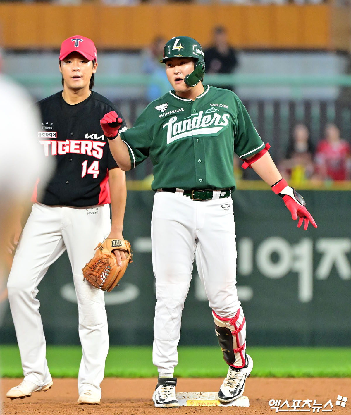 (엑스포츠뉴스 인천, 김한준 기자) 21일 오후 인천SSG랜더스필드에서 열린 '2025 신한 SOL Bank KBO리그' KIA 타이거즈와 SSG 랜더스의 경기, 8회말 1사 1,2루 SSG 고명준이 1타점 2루타를 날리고 있다.