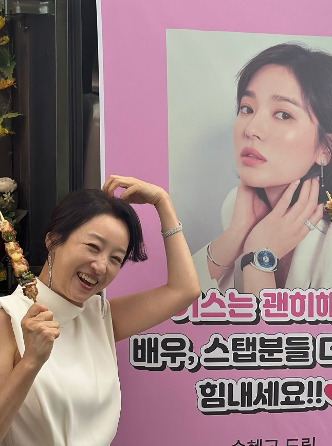 공개된 사진 속에는 두 사람이 다정하게 어깨를 맞대고 활짝 웃고 있는 모습이 담겨 있다. 남기애는 화사한 꽃다발을 들고 있었고, 송혜교 역시 은은한 미소로 훈훈한 분위기를 자아냈다.