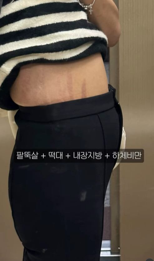 공개된 사진 속에는 "팔뚝살+떡대+내장지방+하체비만"이라는 글과 함께 튼살 사진도 함께 공개됐다.