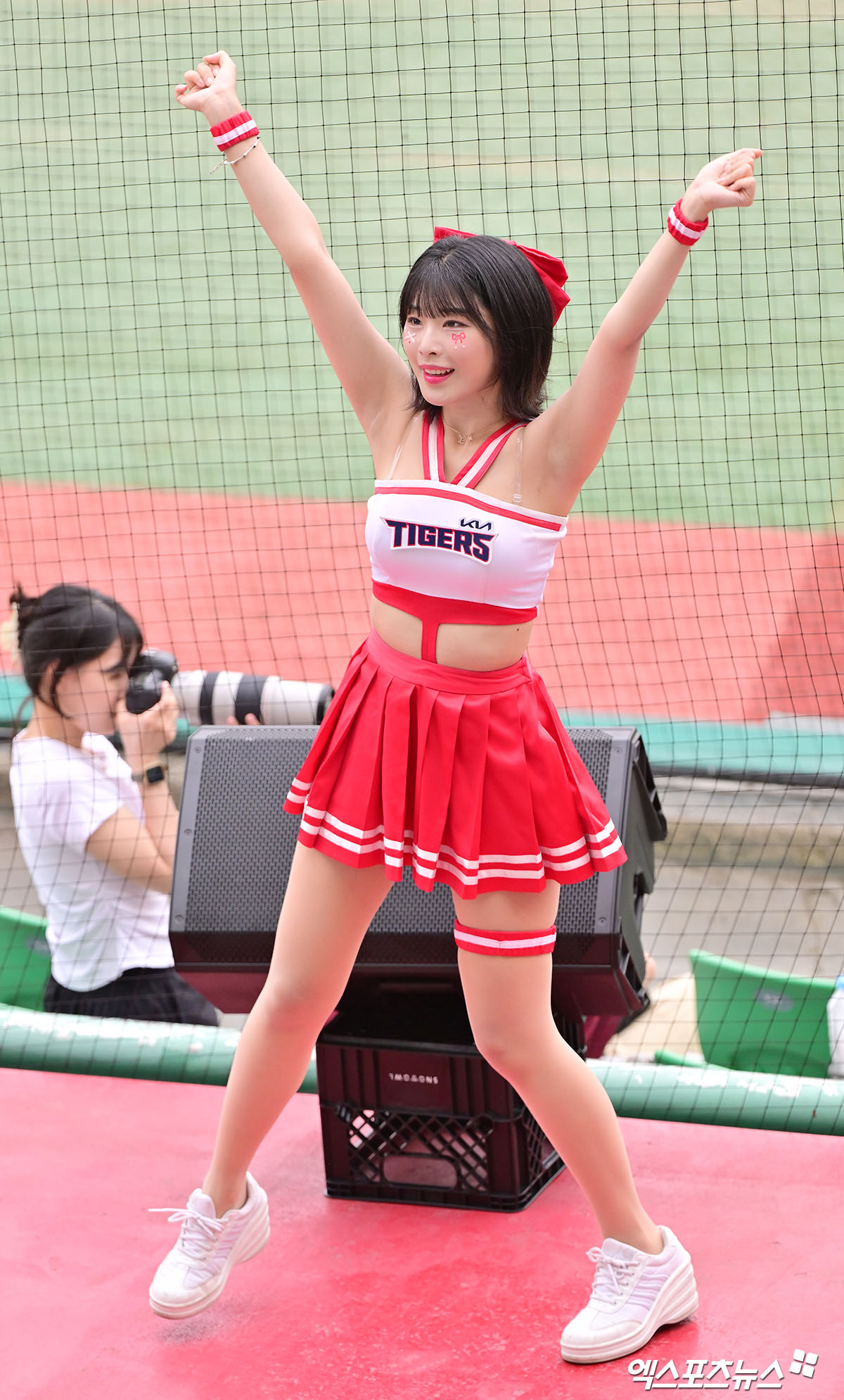 (엑스포츠뉴스 인천, 김한준 기자) 21일 오후 인천SSG랜더스필드에서 열린 '2025 신한 SOL Bank KBO리그' KIA 타이거즈와 SSG 랜더스의 경기, 천소윤 치어리더가 멋진 공연을 선보이고 있다.