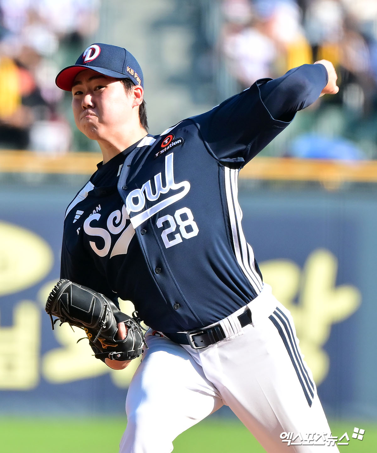 (엑스포츠뉴스 잠실, 김한준 기자) 22일 오후 서울 송파구 잠실야구장에서 열린 '2025 신한 SOL Bank KBO리그' 두산 베어스와 LG 트윈스의 경기, 1회말 두산 선발투수 최승용이 공을 힘차게 던지고 있다.