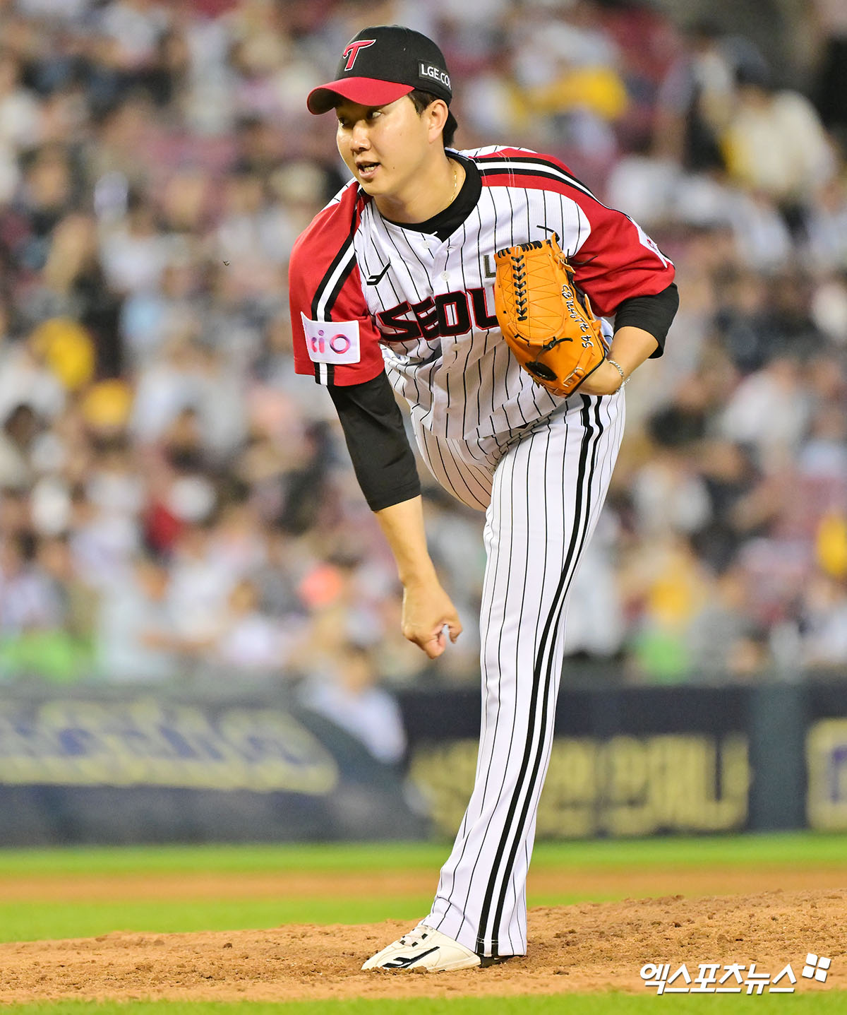 (엑스포츠뉴스 잠실, 김한준 기자) 22일 오후 서울 송파구 잠실야구장에서 열린 '2025 신한 SOL Bank KBO리그' 두산 베어스와 LG 트윈스의 경기, 9회초 LG 유영찬이 공을 힘차게 던지고 있다.