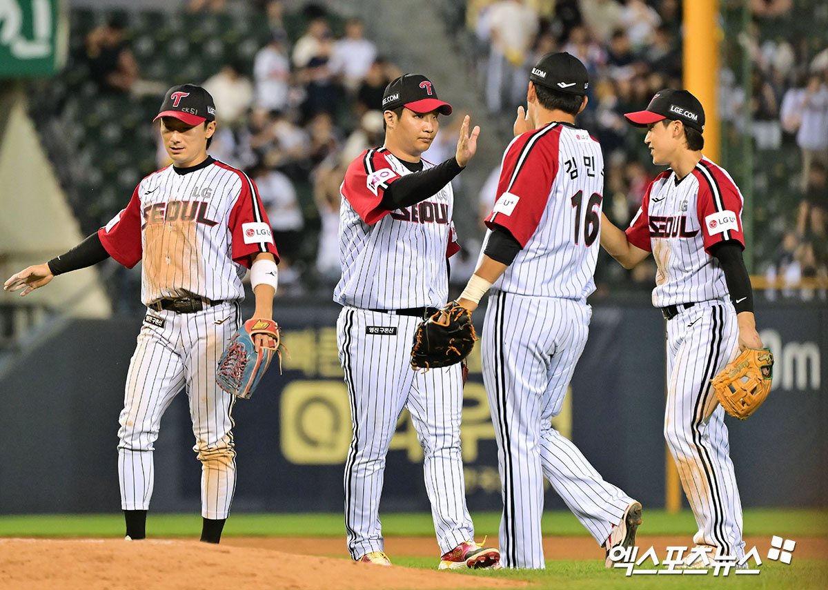 이날 경기에서 승리한 LG 선수들이 기뻐하고 있다.