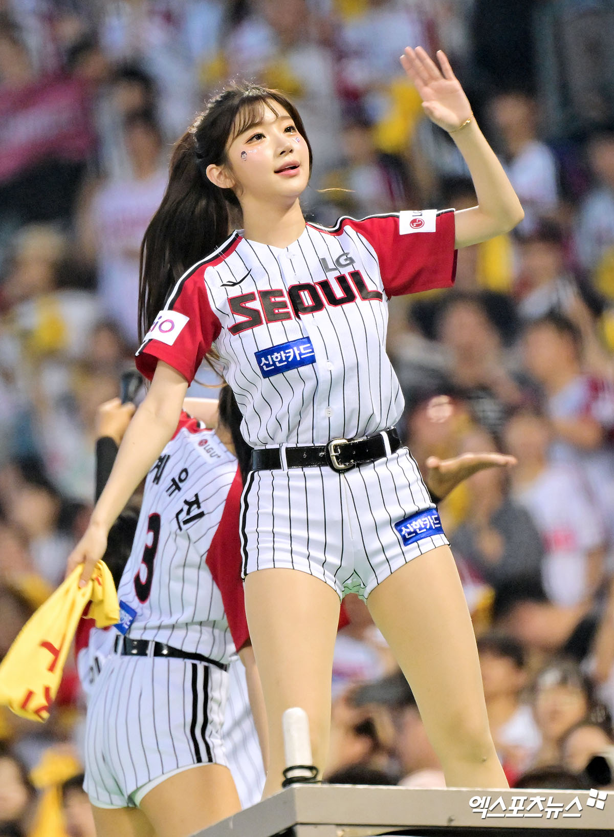 (엑스포츠뉴스 잠실, 김한준 기자) 22일 오후 서울 송파구 잠실야구장에서 열린 '2025 신한 SOL Bank KBO리그' 두산 베어스와 LG 트윈스의 경기, 이주은 치어리더가 열띤 응원을 선보이고 있다.