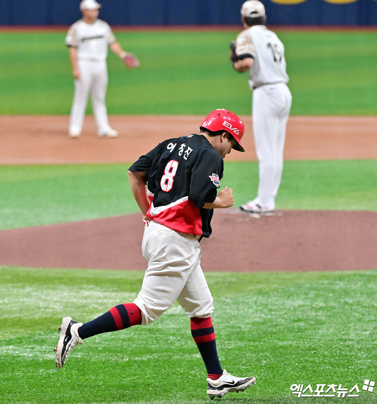 (엑스포츠뉴스 고척, 김한준 기자) 24일 오후 서울 구로구 고척스카이돔에서 열린 '2025 신한 SOL Bank KBO리그' KIA 타이거즈와 키움 히어로즈의 경기, 1회초 KIA 이창진이 볼넷으로 출루하고 있다.