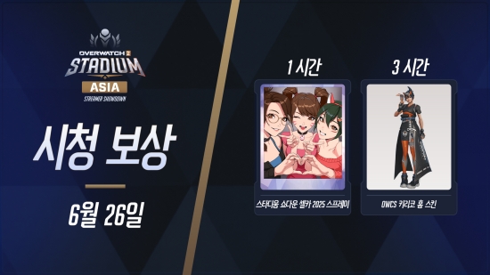 한편, 스트리밍 시청자 대상 보상도 제공된다. '오버워치' 공식 채널에서 생중계 또는 재방송을 1시간 이상 시청하면 '스타디움 쇼다운 셀피 스프레이'를, 3시간 이상 시청하면 '키리코 OWCS 홈 스킨'을 획득할 수 있는 코드가 지급된다. 시청 보상 관련 상세 정보는 공식 블로그에서 확인할 수 있다.