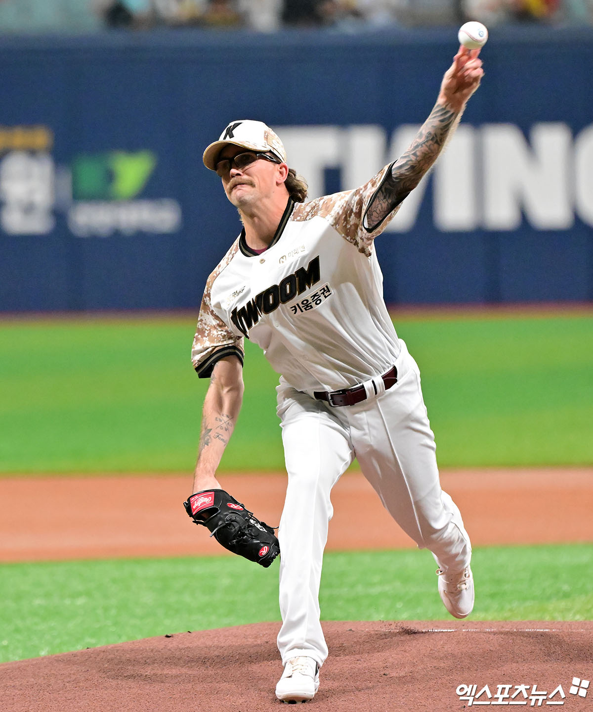(엑스포츠뉴스 고척, 김한준 기자) 25일 오후 서울 구로구 고척스카이돔에서 열린 '2025 신한 SOL Bank KBO리그' KIA 타이거즈와 키움 히어로즈의 경기, 1회초 키움 선발투수 웰스가 공을 힘차게 던지고 있다.