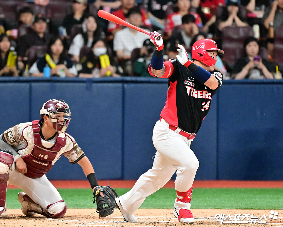 (엑스포츠뉴스 고척, 김한준 기자) 25일 오후 서울 구로구 고척스카이돔에서 열린 '2025 신한 SOL Bank KBO리그' KIA 타이거즈와 키움 히어로즈의 경기, 4회초 KIA 최형우가 중전안타를 날리고 있다.