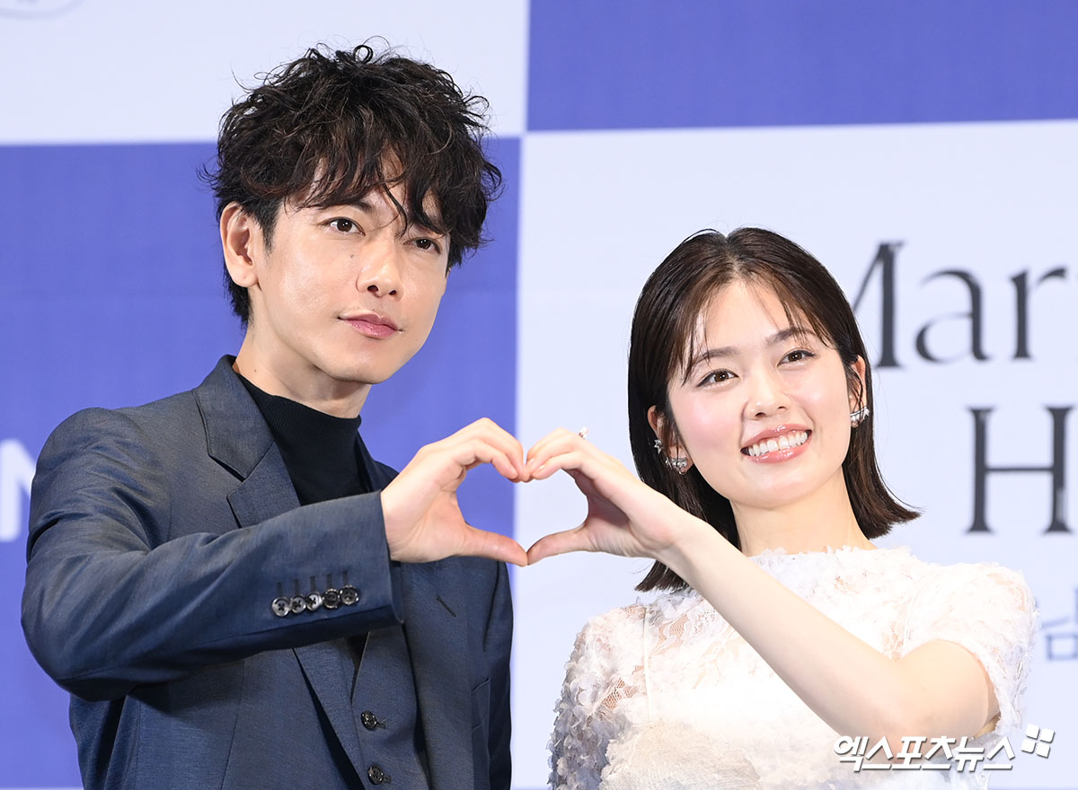 이날 제작발표회에 참석한 일본 배우 사토 타케루, 코시바 후우카가 포토타임을 갖고 있다.
