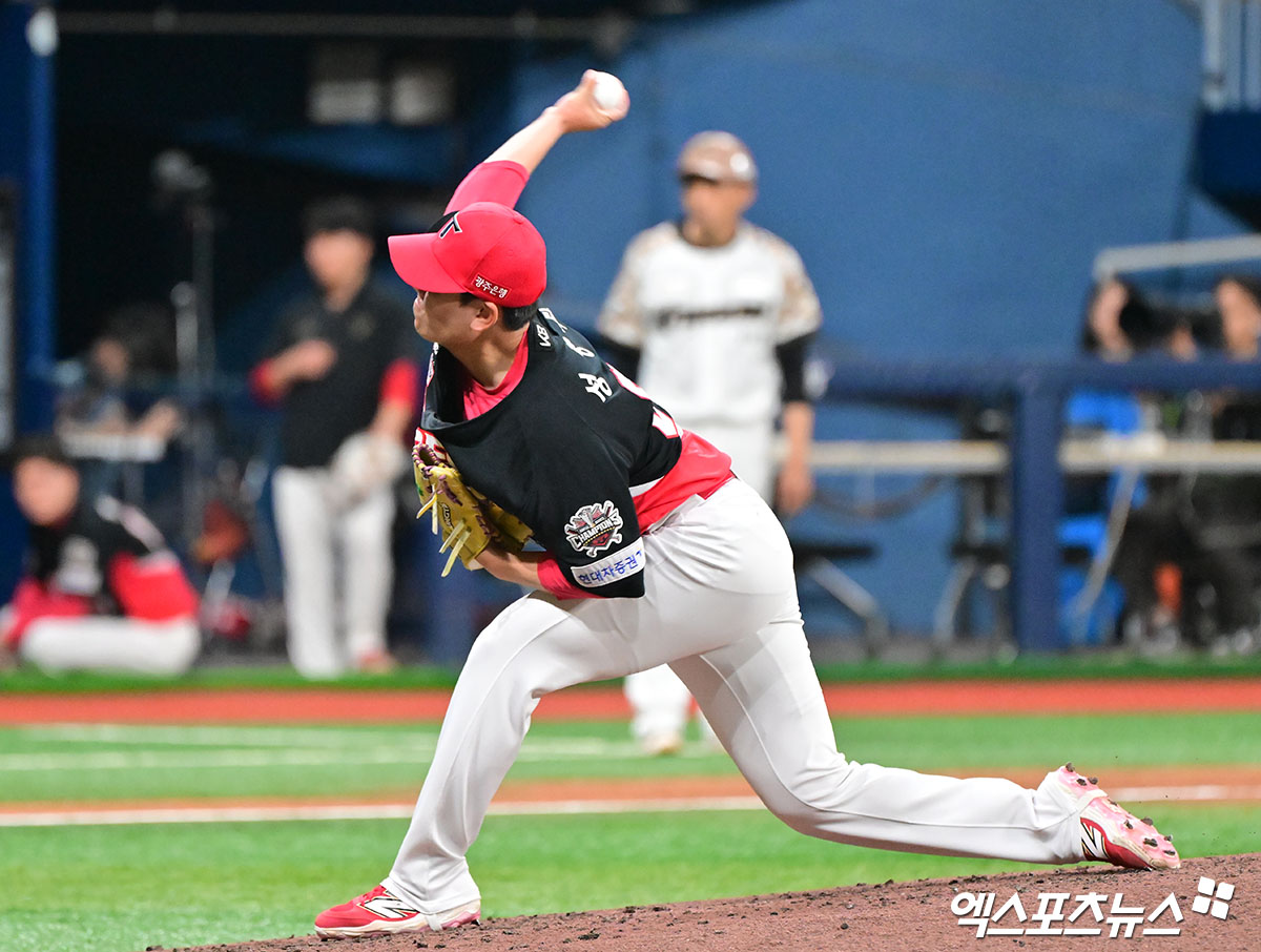(엑스포츠뉴스 고척, 김한준 기자) 26일 오후 서울 구로구 고척스카이돔에서 열린 '2025 신한 SOL Bank KBO리그' KIA 타이거즈와 키움 히어로즈의 경기, 5회말 KIA 성영탁이 공을 힘차게 던지고 있다.