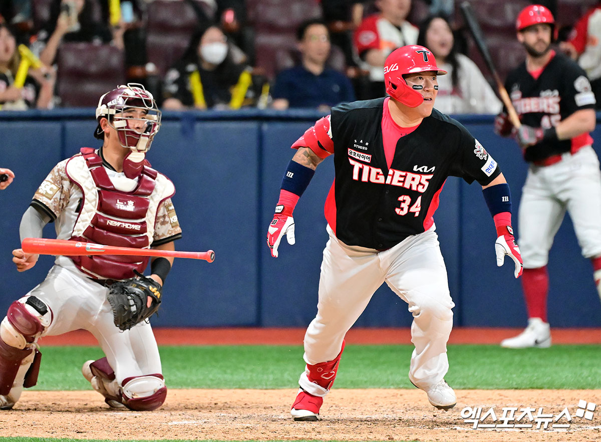 (엑스포츠뉴스 고척, 김한준 기자) 26일 오후 서울 구로구 고척스카이돔에서 열린 '2025 신한 SOL Bank KBO리그' KIA 타이거즈와 키움 히어로즈의 경기, 10회초 1사 1루 KIA 최형우가 우전안타를 날리고 있다.