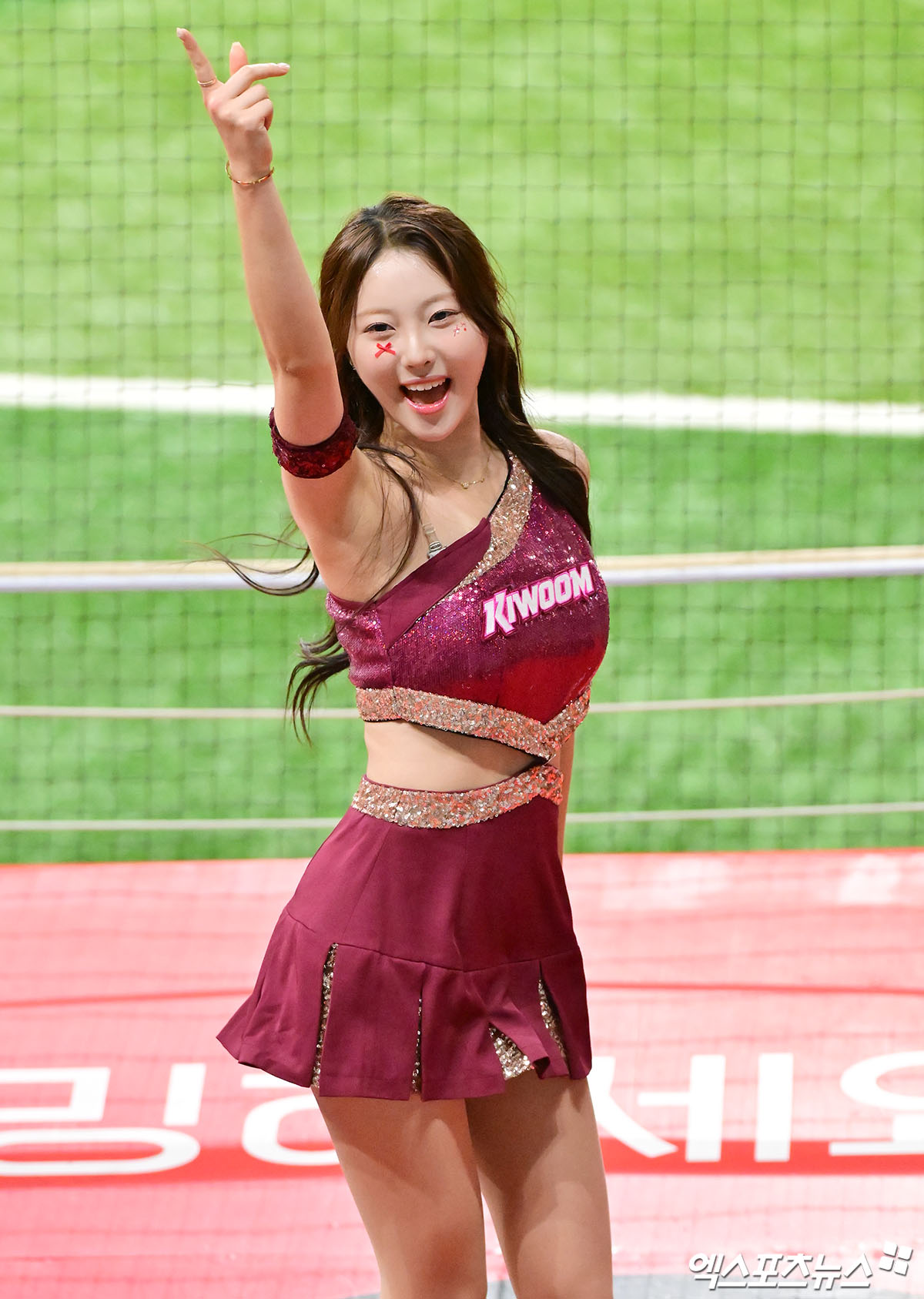 (엑스포츠뉴스 고척, 김한준 기자) 27일 오후 서울 구로구 고척스카이돔에서 열린 '2025 신한 SOL Bank KBO리그' 삼성 라이온즈와 키움 히어로즈의 경기, 송민교 치어리더가 멋진 공연을 선보이고 있다.