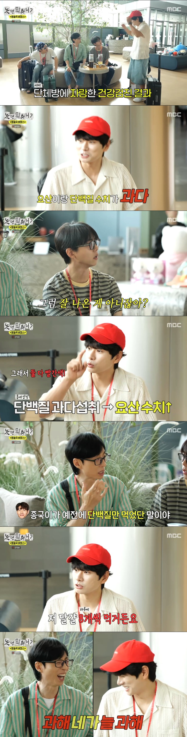 그러자 유재석은 "이거 얘기를 해줘야겠다"면서 "단백질을 너무 많이 먹으면 요산이 올라간다. 그래서 요산이 그렇게 높으면 통풍이 온다. 종국이가 예전에 탄수화물 안 먹고 막 단백질만 먹었다가 통풍이 왔다"고 설명했고, 이이경은 "저 계란 8개씩 먹거든요"라고 덧붙였다.