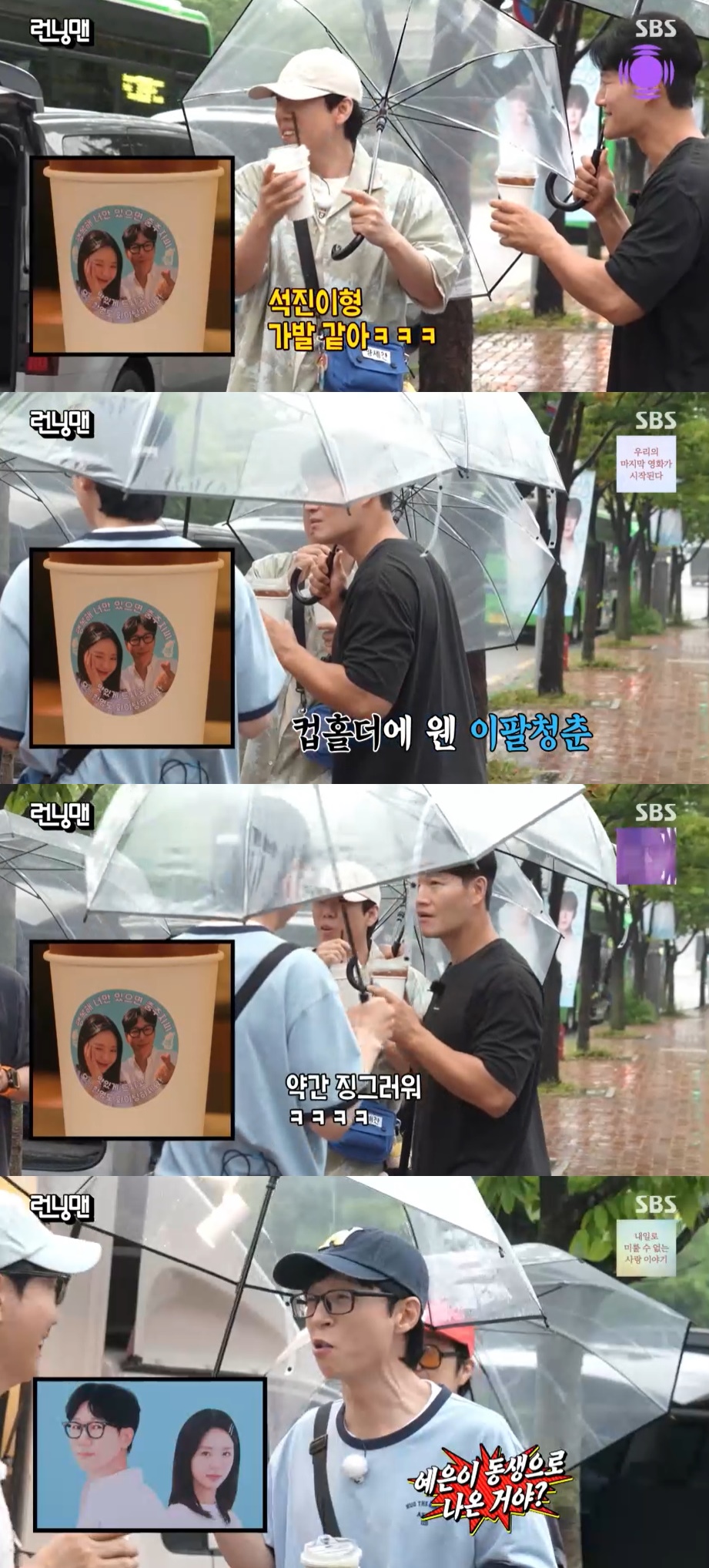 지석진은 커피차를 약속한 뒤 홍보를 마쳤고, 이날 지석진과 지예은은 약속대로 커피차를 선물했다. 컵홀더에 있는 '충주 지씨'의 사진 속 지석진을 본 양세찬은 "석진이 형 가발 같아"라고 말했다.