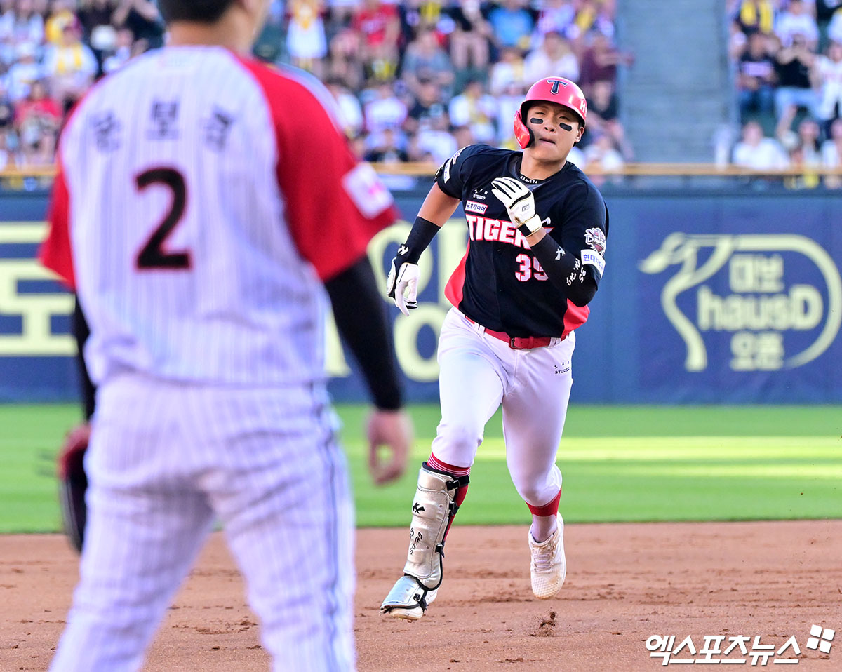 (엑스포츠뉴스 잠실, 김한준 기자) 29일 오후 서울 송파구 잠실야구장에서 열린 '2025 신한 SOL Bank KBO리그' KIA 타이거즈와 LG 트윈스의 경기, 6회초 1사 2,3루 KIA 김석환이 2타점 3루타를 날리고 있다.