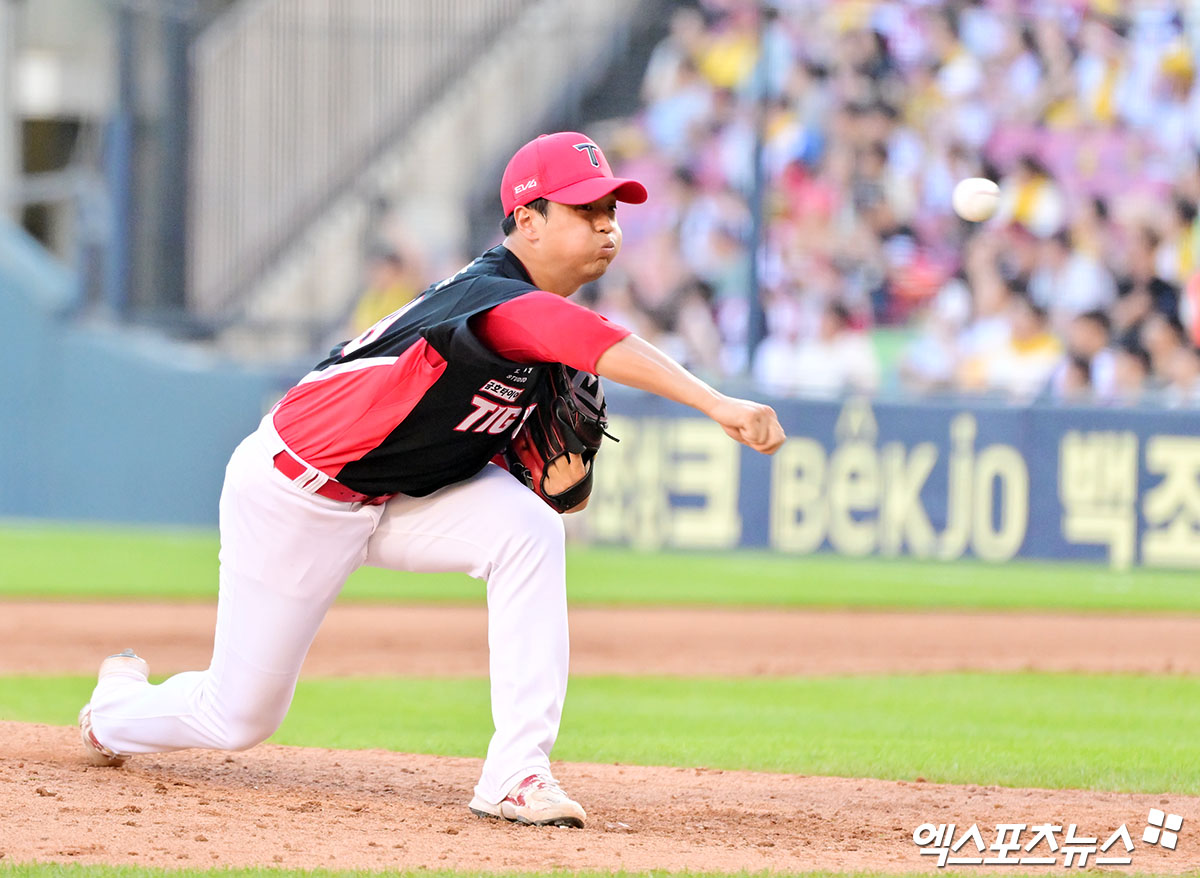 (엑스포츠뉴스 잠실, 김한준 기자) 29일 오후 서울 송파구 잠실야구장에서 열린 '2025 신한 SOL Bank KBO리그' KIA 타이거즈와 LG 트윈스의 경기, 6회말 KIA 김민주가 공을 힘차게 던지고 있다.