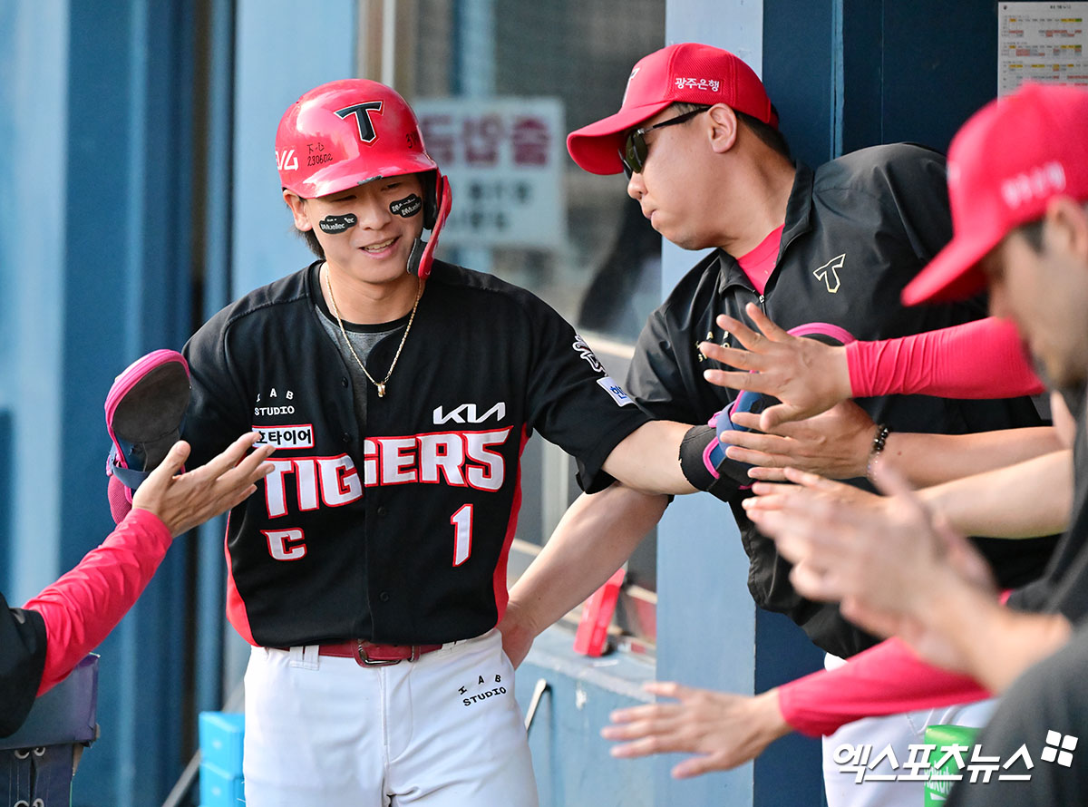 (엑스포츠뉴스 잠실, 김한준 기자) 29일 오후 서울 송파구 잠실야구장에서 열린 '2025 신한 SOL Bank KBO리그' KIA 타이거즈와 LG 트윈스의 경기, 8회초 2사 3루 KIA 박찬호가 김태군의 1타점 적시타때 득점에 성공하고 있다.