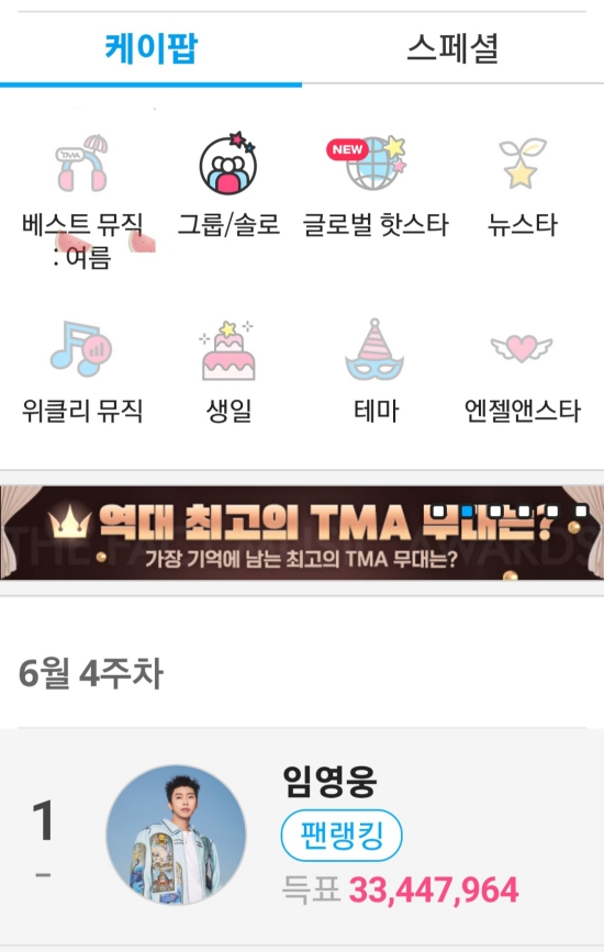 최근 '팬앤스타'에 따르면, 임영웅은 6월 4주 차 솔로가수 인기 랭킹 투표에서 1위에 등극했다.