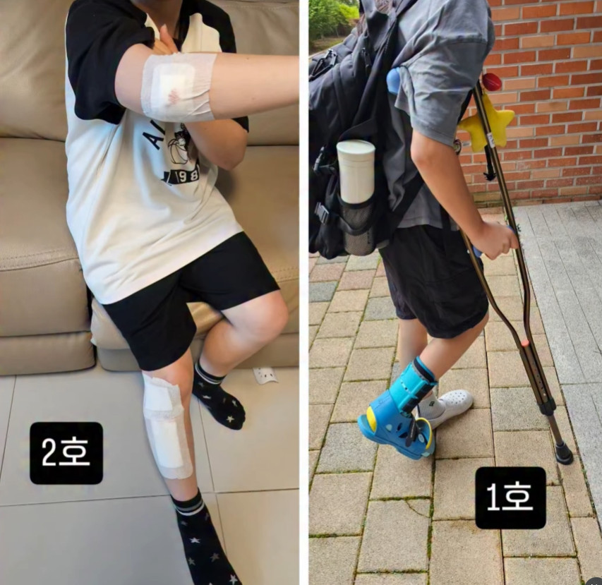 공개된 사진에는 딸이 발목을 다쳐 목발을 짚고 있는 모습, 아들은 팔과 다리에 부상을 당해 반창고를 잔뜩 붙여놓은 모습이 담겼다.