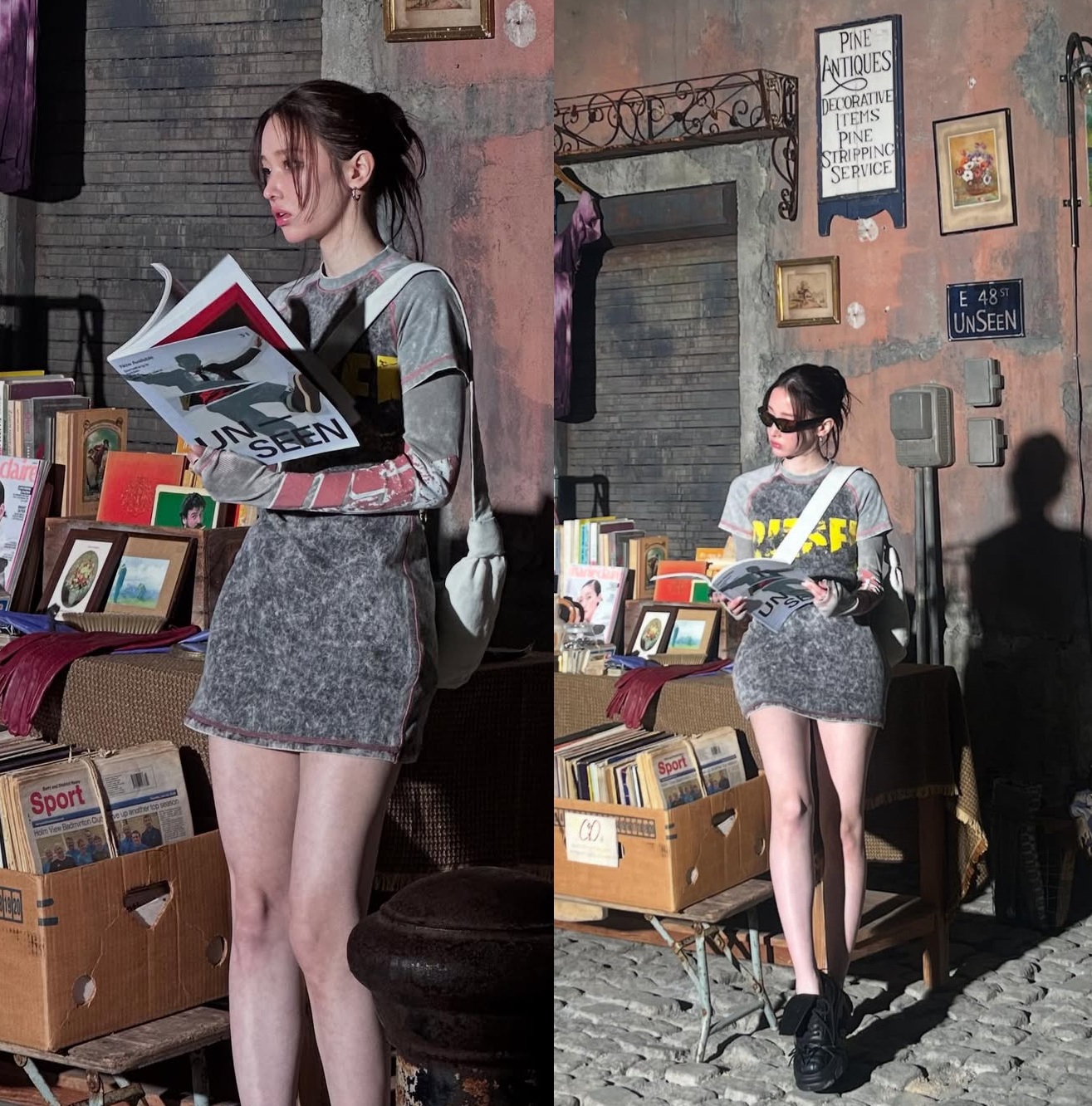 큰 잡지를 자연스럽게 펼쳐 든 채 시선을 돌리며 영화 속 한 장면 같은 아우라를 뿜어냈다. 미니멀한 화이트 숄더백과 군더더기 없는 액세서리 선택이 전체적인 룩의 조화를 이루며 센스를 더했다.
