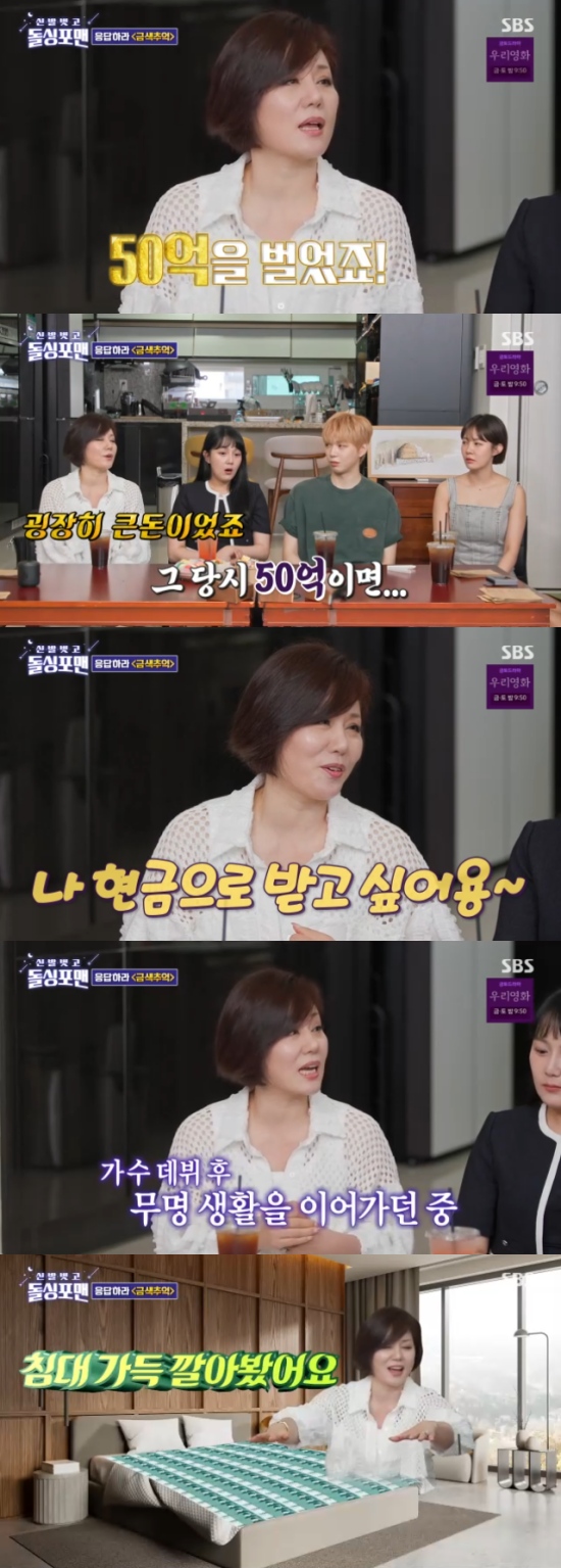 그리고 이날 한혜진은 연이은 히트곡으로 엄청나게 큰 돈을 벌었었다고 말했다. 한혜진은 "무명생활을 하다가 '갈색추억'으로 터졌다. 이어 '너는 내 남자'도 터지면서 50억을 벌었다"고 말해 모두를 깜짝 놀라게 했다.