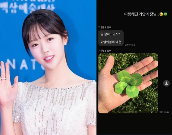 공개된 사진에는 기안84가 지예은을 걱정하는 따뜻한 안부 내용이 담겨 있었다. 기안84는 "일 잘하고 있지? 쉬엄쉬엄해 예은"이라며 사진 하나를 지예은에게 전송했다. 기안84가 직접 네잎클로버를 손에 올리고 찍은 듯 보이는 사진에서 지예은을 진심으로 아끼는 마음이 엿보인다.
