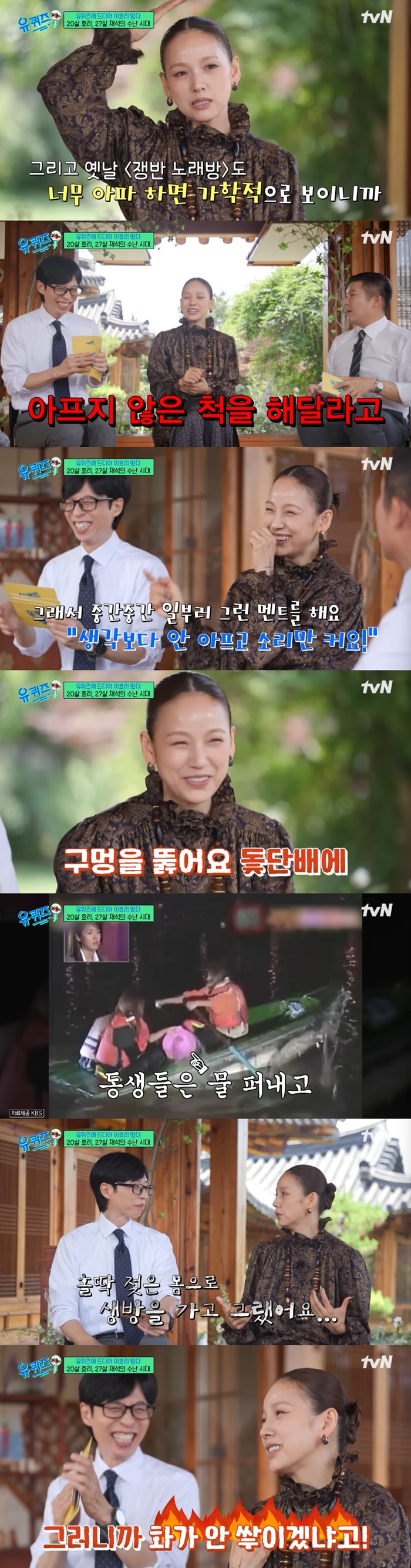 이효리는 "물을 뒤집어써도 '시원하다'고 했었다. 저도 뒤로 날아가는 (플라잉 체어)거 했었다. 날고 떨어지고"라며 "제일 기억 나는 건 조그마한 돛단배에 넷이 탔는데 배에 구멍을 뚫고 한강을 건너라고 하는 거였다"고 이야기했다.