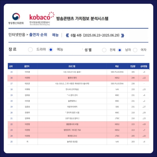 최근 방송통신위원회의 방송콘텐츠 가치정보 분석 시스템(RACOI) 지수에 따르면, 이찬원은 2025년 6월 4주(6월 23일~6월 29일) 인터넷 반응 분석 출연자 순위에서 KBS 2TV '불후의 명곡'으로 남성 예능 출연자 16위를 기록했다.